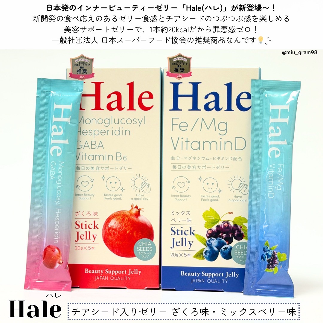 - 「Hale ざくろ味」には、今注目のモノグルコシルヘスぺリジン、GABA、ビタミンB6と美容をサポートする成分を配合し、「Hale ミックスベリー味」には、女性に不足しがちな鉄分、マグネシウム、ビタミンDを配合しています。2品ともに新開発の食べ応えのあるゼリー食感とチアシードのつぶつぶ感を楽しめる美容サポートゼリーです。5本タイプと手軽な1本タイプがあり、外で小腹が空いた時など、カバンに持ち運べるサイズでいつでも楽しむことができます。