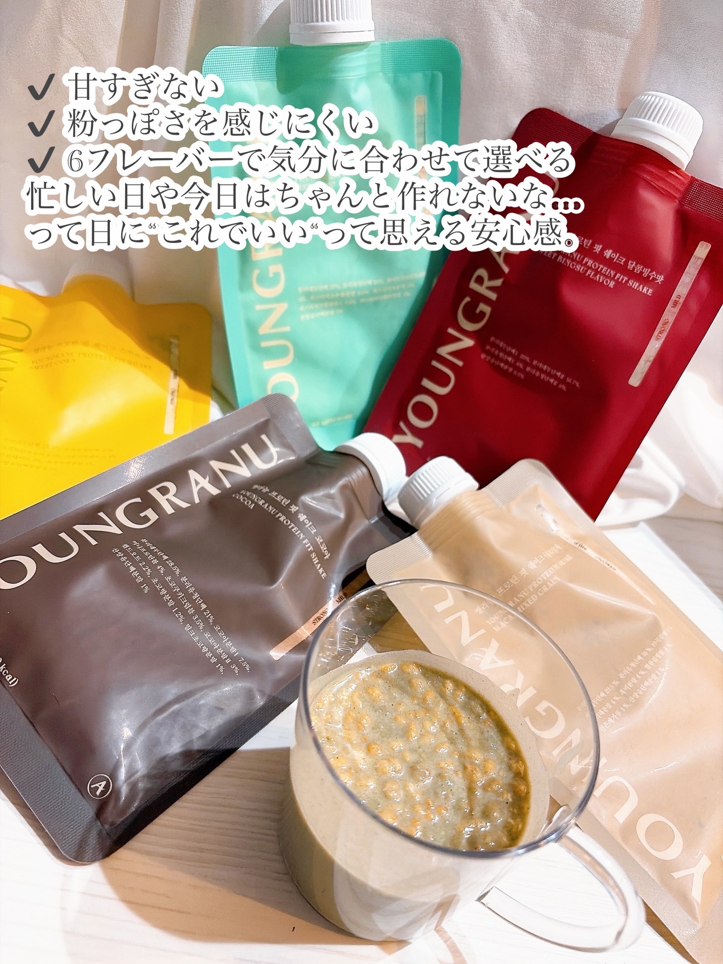・ YOUNGRANUプロテインフィットシェイクあずきピンススイートコーンヨモギラテピスタチオ穀物黒ゴマココアの全6種類1包約20gのタンパク質とたくさんの栄養素を補ってくれる珍しいフレーバーが揃ってるのも置き換えダイエットにもぴったりな満足...