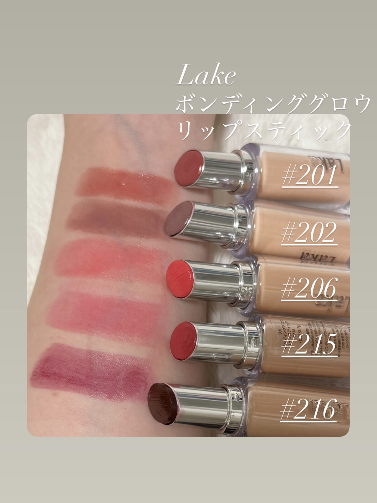 【随一の光沢感】○Lakeボンディンググロウリップスティックデビルリップが話題だけど、こっちも負けちゃいない!!カラバリは全20色。今回紹介する5色はブルベ向きかな☆201ミロこの中だとパーソナルカラーを選ばないお色味☆202ボーイ☆206リ...