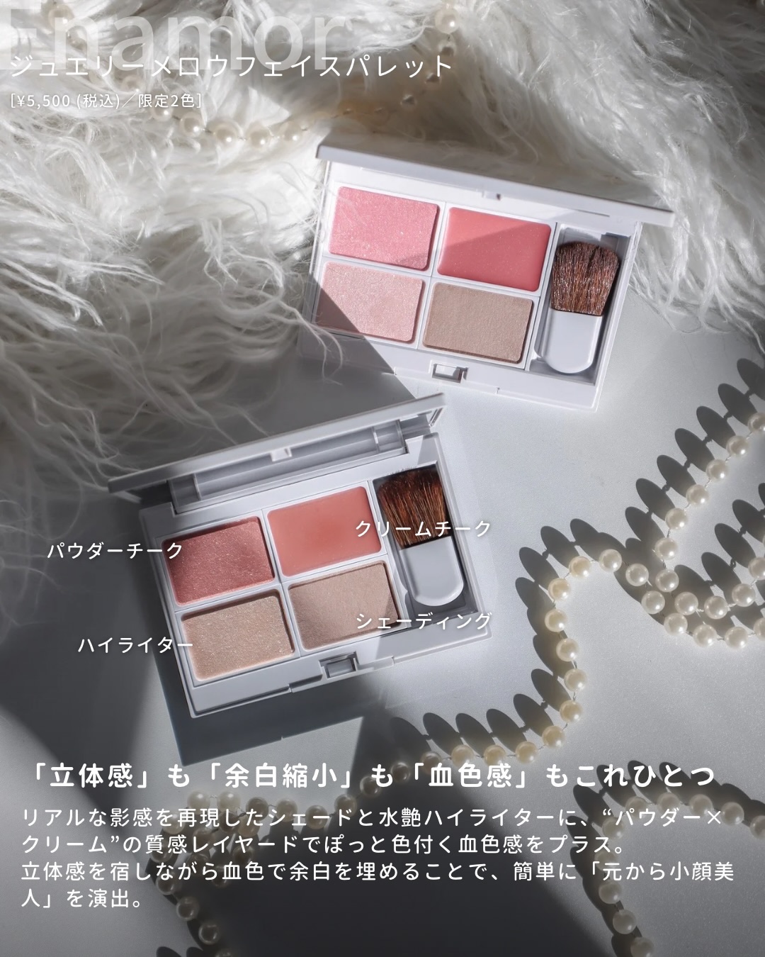 - 【2025クリスマスコフレ】〈数量限定〉 本来はテクニックが必要な立体感メイクを、ワンパレットでシンプルに。 「小顔見え」に欲しい工程をぎゅっと1つに凝縮した、”血色小顔パレット”。 “光×影”のコントラストで骨格美人のベースを作り、 “パウダー×クリーム”の質感レイヤードでぽっと色付く血色感をプラス。 立体感を宿しながら、血色で余白を埋めることで、簡単に「元から小顔美人」を演出します。 【予約日・発売日の情報】 本商品は季節限定・EC限定での発売となります。 <先行発売・全国発売日> 先行販売:2025年11月20日(木) 全国発売:2025年12月1日(月) ※Enamor公式オンラインストアでは予約・発売ともに12:00より開始です。