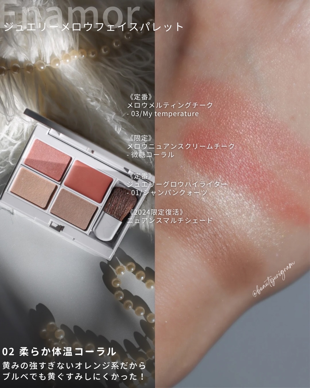 #Enamor☑︎#ジュエリーメロウフェイスパレット ↪︎01大人のあどけなピンク ↪︎02柔らか体温コーラル人気のメロウメルティングチークに去年のホリデー限定だったシェーディングにハイライトそして今回限定のクリームチークが入った贅沢なパ...