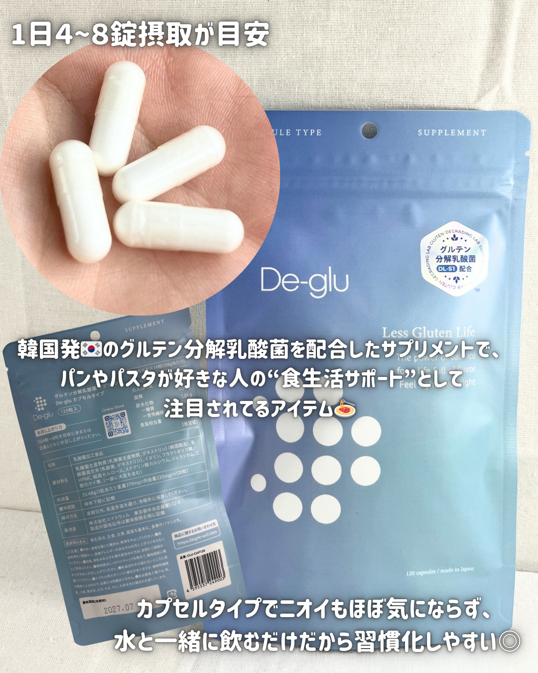 体やお肌のためにグルテンフリーにチャレンジしたいけどパンやパスタ、ケーキなど小麦粉食品が大好きすぎで完全にやめるのは無理...😢そんな私が飲んでいるのはグルテン分解乳酸菌De-glu(デグル)サプリメント🩵韓国の伝統発酵食品から発見された新た...