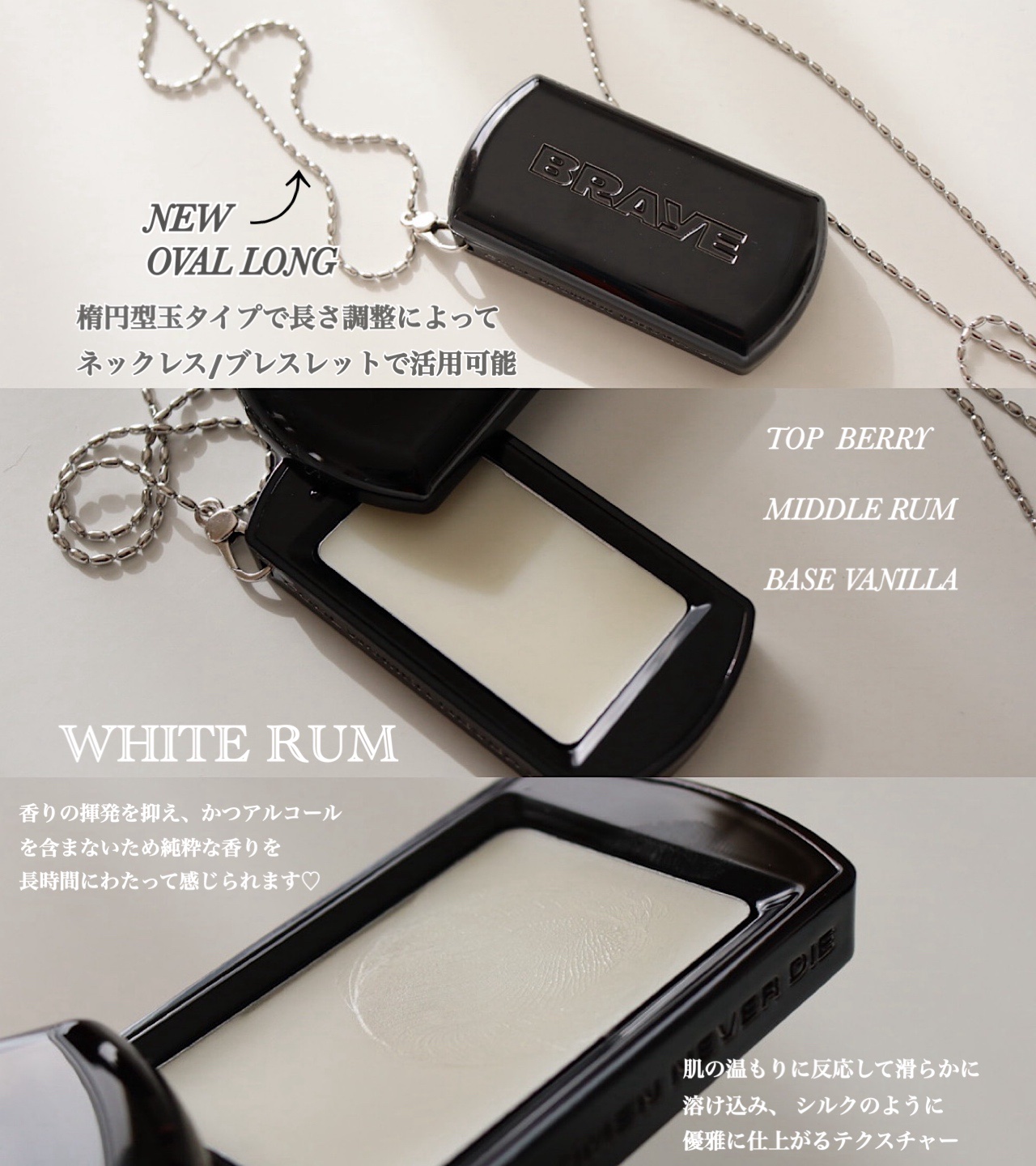 - センティッドバームは、クールで洗練された女性のスタイルを完成させるラストタッチとして誕生した「ソリッドパフューム」です。 アクティブな日々をエレガントに楽しむ女性から、静かで落ち着いた日常を慈しむ女性まで、BRAYEだけが持つ独特なムードをどこでも手軽に、そして魅力的にお楽しみいただけます。 ●ホワイトラム 穏やかな夜、ホワイトラームを片手に思索にふける品格のある女性の優雅で官能的な香り 甘くも冷ややかなベリー系の香りで始まり、ドライローズのローズ、バニラの風味を儚い香りと、 じっくりと熟成されたラムの深みが調和し、落ち着いた夜、静かなバーでホワイトラムを傾けながら思索にふける上品な女性を訪仏させます。 ●ブルージーンズ ブルージーンズのクールで爽やかな雰囲気と、瑞々しいシトラスが放つ その日に安らぎと解放感を込めた、心地よい香り。 瑞々しいタンジェリンの香りに新鮮なトマトリーフが加わり、誘き通る青空の下でブルージーンズを身に纏い、 自由な気持ちで街を歩くような心の安らぎがすっきりとした香りと共に広がります。