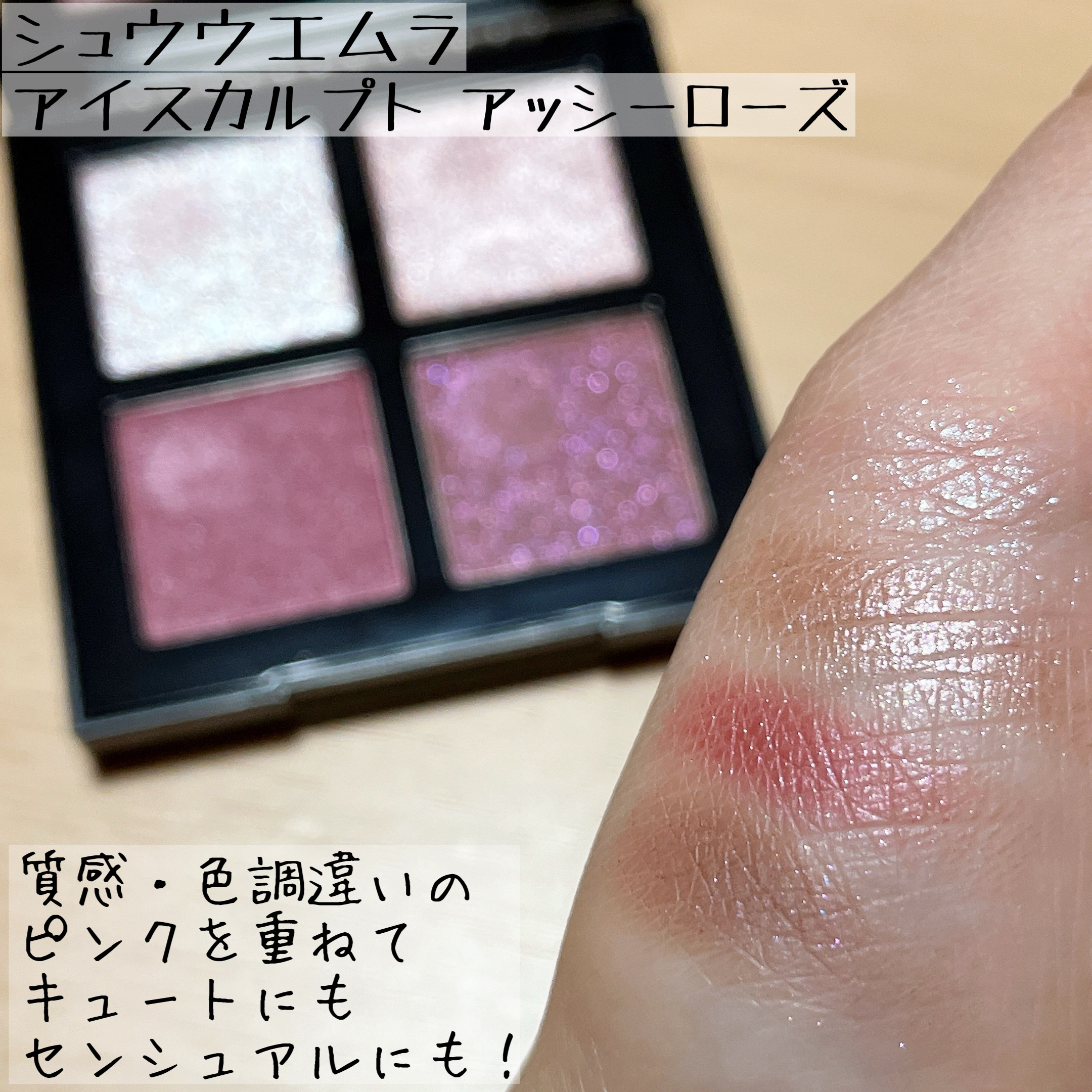 シュウウエムラアイスカルプトアッシーローズ春の訪れを彩るトレンドのネオンピンクのきらめきが詰め込まれた心弾む#ほろ甘ピンクなパレット質感、色調が違うピンクのカラーがどれも綺麗で可愛い♡粉質もきめ細やかで塗りやすく持ちも良かったです✨透明感のあ...