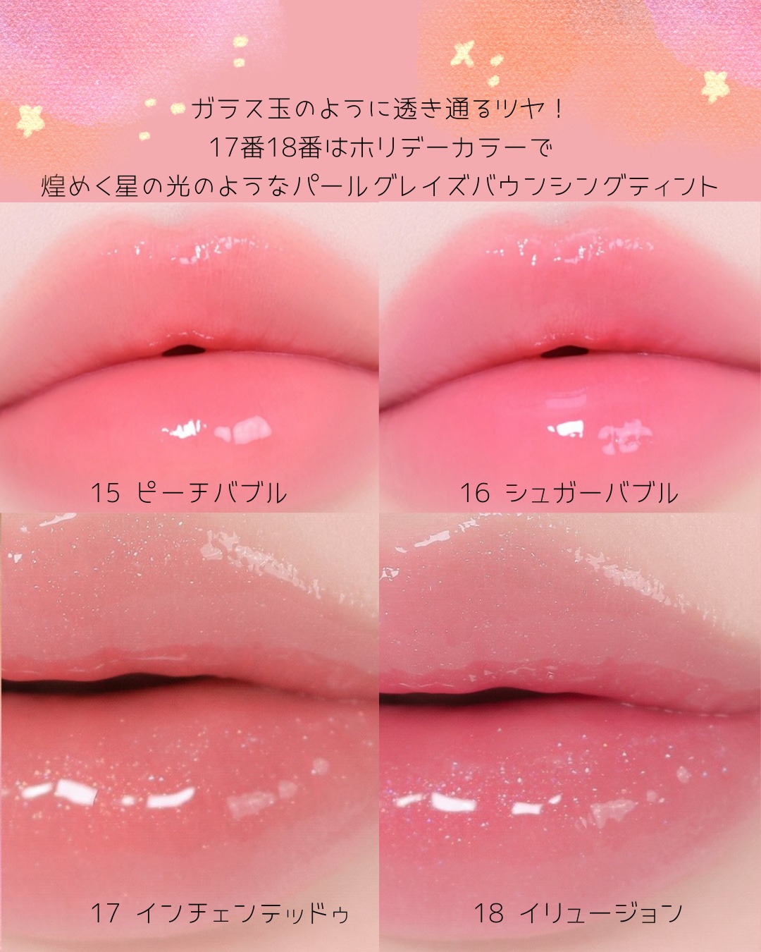 - ほんのりプランピング効果で痛くないぷっくりティント。 もっちりなのに嫌なべたつきがなく使いやすい。 縦ジワがなくなる綺麗な唇を~! ひと塗りで輝く、 澄んだ透明感あふれるぷるんとしたキャンディツヤ🍭 ティントにグロスの長所をプラスしたテクスチャーで、 ベタつかず長時間続く光沢を ✧˖*°࿐