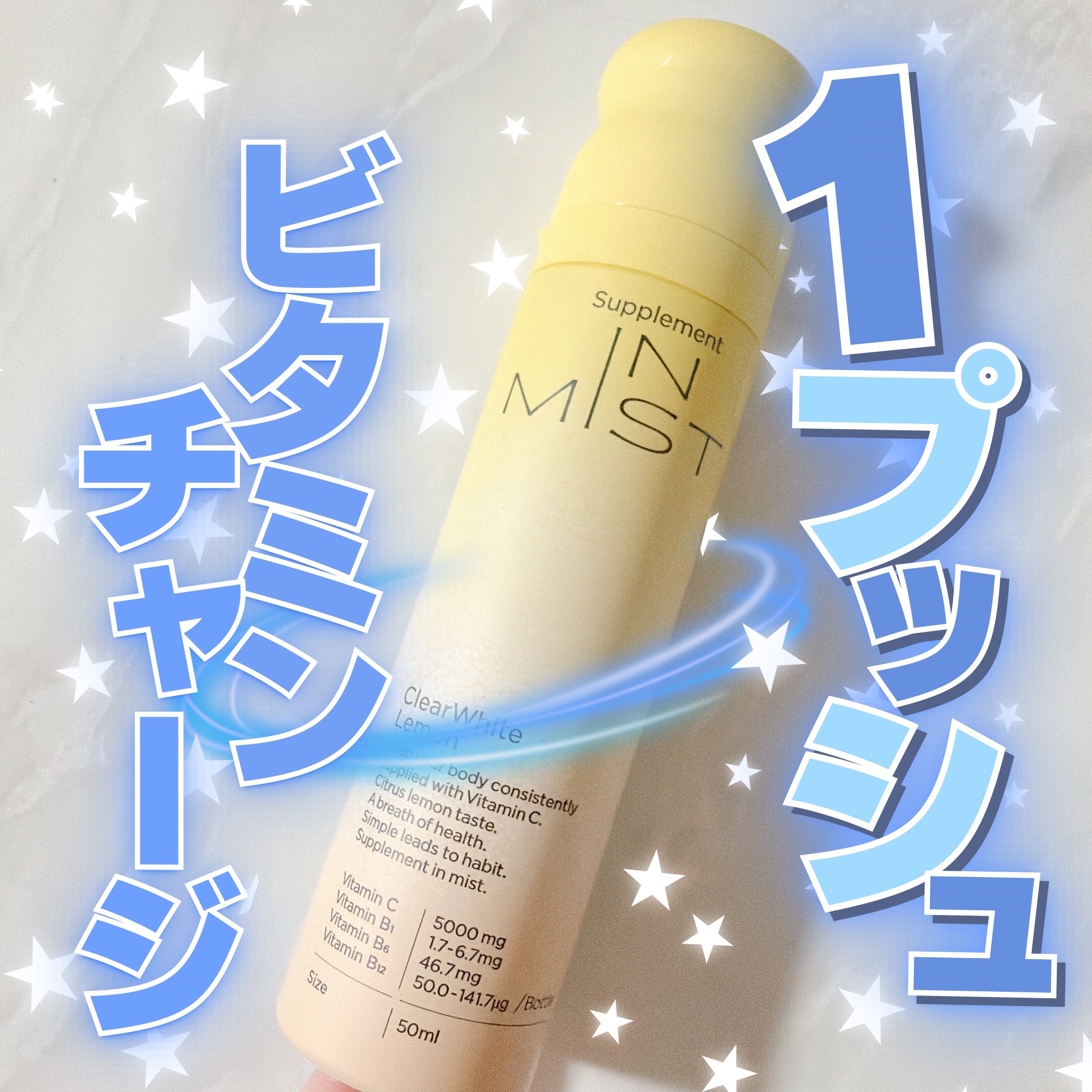- ワンプッシュの美容ルーティン こまめなビタミン補給が、キレイの秘訣。 IN MISTは、ミストという独自の形でこの課題に対処しました。 水も不要、外出先でも美味しくワンプッシュ。液体ミストですぐに補給。独自開発の2重構造ボトルで常に高品質のまま届けます。 ◆ClearWhite Lemon とは ワンプッシュ1mlで1日分のビタミンC*が美味しく補給できるミストタイプのサプリメント(シトラスレモンテイスト) ClearWhite Lemonは、劣化しやすいビタミンCを「ピュアビタミンC」として配合。ダイレクトにアプローチし、美容と健康をサポートします。さらに、健康維持に欠かせないビタミンB群(B1、B6、B12)も含まれています。 <栄養機能食品> ビタミンCは、皮膚や粘膜の健康維持を助けるとともに、抗酸化作用を持つ栄養素です。 *「栄養素等表示基準値」における1日分のビタミンC ◆使い方 STEP.01 容器のフタを開ける STEP.02 ノズルを口に向けてワンプッシュ 1本で約25日間を目安にお使いいただけます。(目安量1日2回プッシュの場合) ※使用回数や噴射時間によって個人差があります ◆ClearWhite Lemon の特徴 1.こまめなビタミン補給が、キレイの秘訣。 ビタミンは数時間で体外に排出されるため、本当に大切なのは“こまめな補給”。 IN MISTなら水も不要で、どこでも美味しくワンプッシュ。持ち運びもしやすいから、外出先でも。しかも液体ミストだからスムーズに届きます。 2.独自開発の2重構造ボトルで高品質なビタミンを ビタミンは光や空気に弱いデリケートな成分。そんなビタミンを守るため、IN MISTは徹底的にこだわりました。 独自開発のアルミ2重構造ボトル“フレッシュキープボトル”で、ビタミンを徹底ガード。 最後のワンプッシュまで、高品質なビタミンをお届けします。 3.誰もが続けやすいサプリ体験 サプリメントで最も大切なのは「継続すること」。 ワンプッシュの手軽さと、独自の創味技術で仕上げた美味しさで、誰でも自然に続けられるサプリ習慣で内側から美しさを。