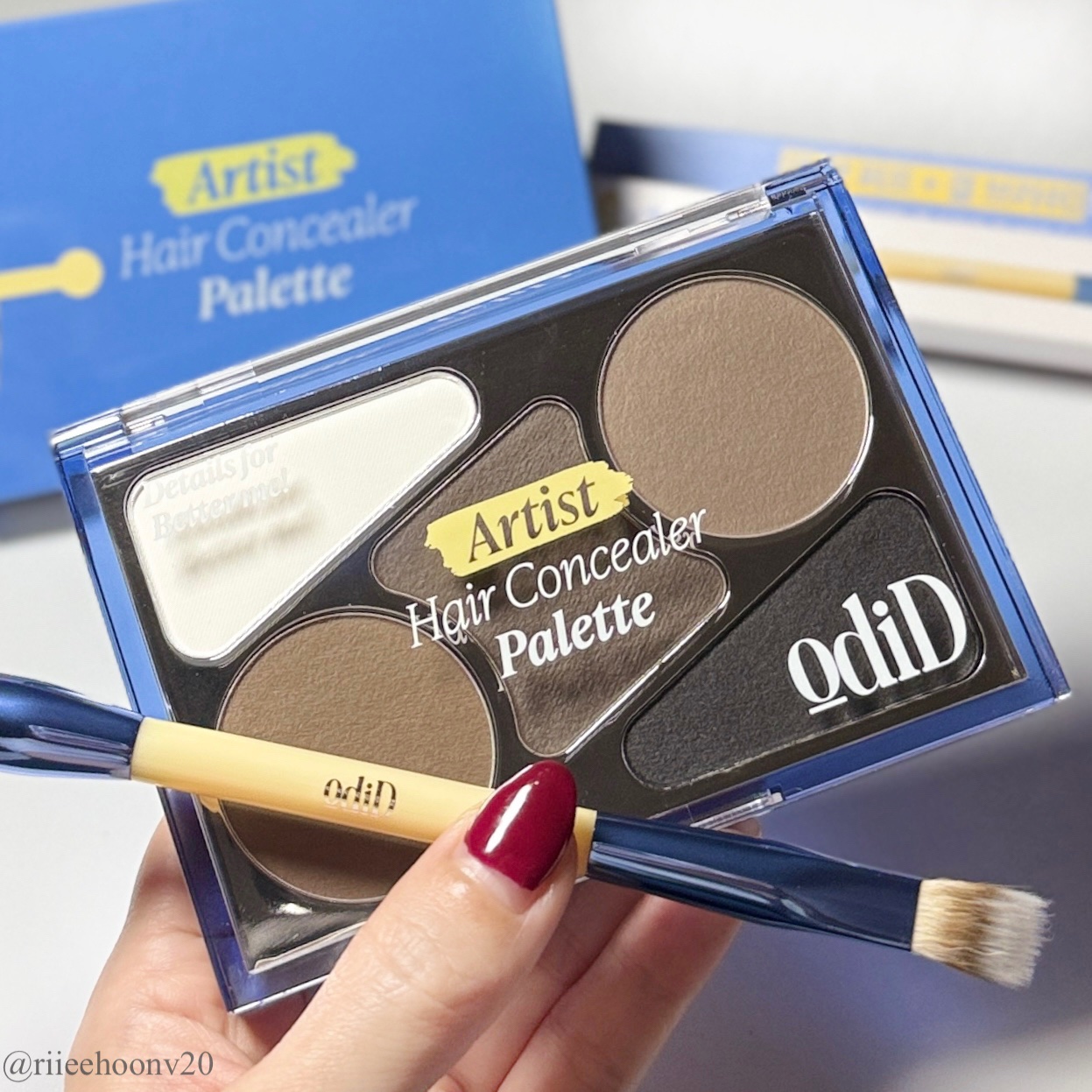 最近のヘアライン悩みに🪄 odiDヘアコンシーラーパレット&デュアルブラシを使ってみたよ。使い方は、 パウダーブラシでおしろいをのせて頭皮の油分をオフ→ 密着パフでカラーをなじませながら調合→ 気になる生え際や頭頂部にポンポンするだけ◎4色入...