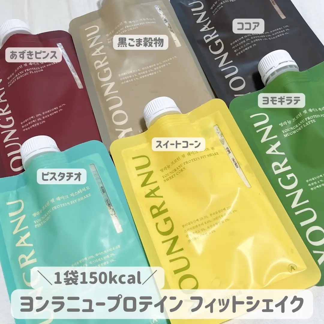 🏷︎⸝⋆PR美味しくヨンラニューチャレンジ🥤𓈒𓂂𓏸YOUNGRANUプロテインフィットシェイク🥤あずきピンス・穀物黒ゴマ・よもぎラテ・ピスタチオ・ココア・スイートコーンの全6種類水や牛乳、豆乳を目盛...