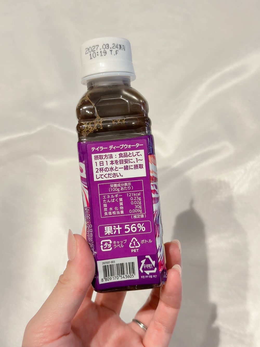 話題のドリンク試してみた!お通じ良くなりすぎてヤバいと噂の韓国のドリンク飲んでみた!テイラーDEEPWATERプルーン味の腸活ドリンクで、サイズは小さめペットボトル。とはいえ、効果が本当にすごいから家に1日いられて予定がない時にするべき!って...