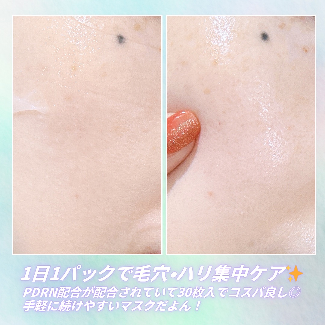 - 日本限定!30枚マスクシリーズに「PDRN リフティングマスク」が新登場! 純度99%ローズ由来PDRNが肌に弾力を与え、 キメの整ったなめらかでハリのある肌へと導きます。 【こんな方におすすめ】 毛穴やカサつく肌が気になる方 朝も夜も、サッと使えてハリ+肌キメケアをしたい方 肌にやさしく、毎日使えるパックを探している方