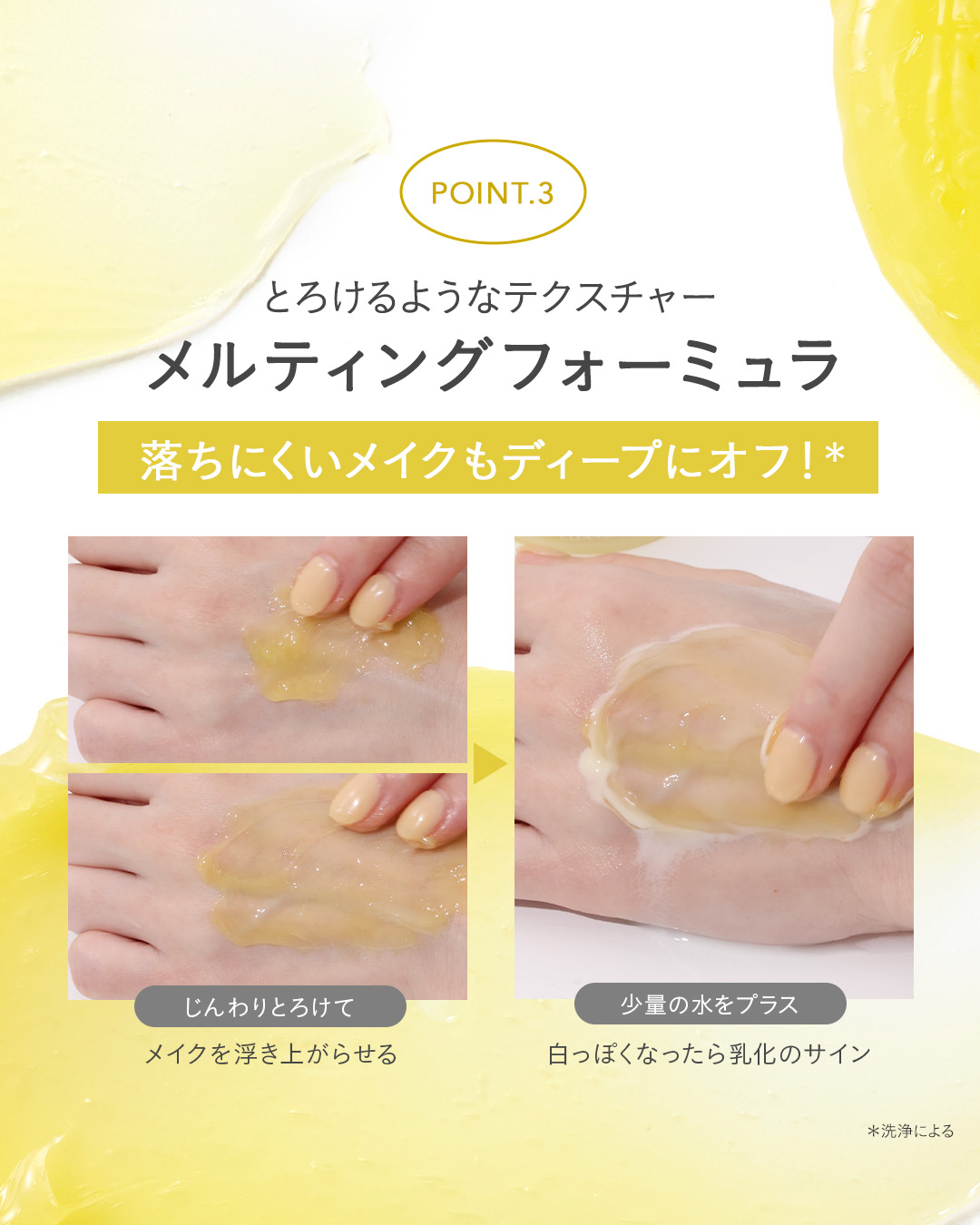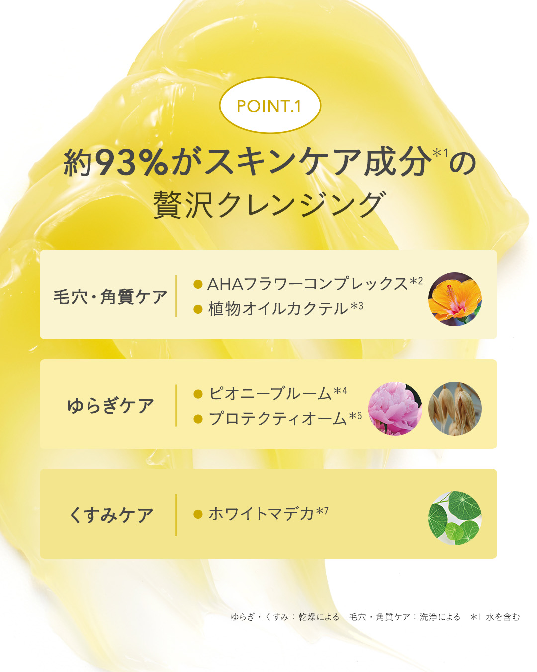 - ○KEY INGREDIENTS:ピオニーブルーム*1、プロテクティオーム*2、AHAフラワーコンプレックス*3、植物オイルカクテル(月見草オイル*7、ローズヒップオイル*8、オリーブオイル*9、ホホバオイル*10、アボカドオイル*11)、ホワイトマデカ*5 ※太文字はリニューアルによる新配合成分です ○効果:ディープクレンジング、鎮静、角質&毛穴ケア、透明感*6、ハリ・キメ・バリア機能サポート ○香り:シダーウッド*12、サイプレス*13、イランイラン*14、オレンジ*15、ローズ*16 ※合成香料不使用 POINT 1.メイクオフしながら毛穴&ゆらぎにアプローチして、なめらか肌へ 肌に負担をかけずメイクや毛穴や角質汚れをしっかりと落とし、なめらかな洗い上がりを叶える植物由来成分を豊富に配合。 【ゆらぎケア・鎮静】 ゆらぎやすい肌を鎮静し、肌の常在菌バランスをすこやかに ・ピオニーブルーム*1 シャクヤク花エキスと植物由来のタンパク質の複合成分 ・プロテクティオーム*2 オーツ麦と乳酸菌など、3つのバイオーム原料による複合成分 【角質・毛穴ケア】 AHAや、植物オイルとグリセリンによる温感効果で、気になる汚れをオフ ・AHAフラワーコンプレックス*3 ハイビスカスやセイヨウサンザシの花から抽出した角質ケア成分 ・植物オイルカクテル*4 月見草やローズヒップオイルなど、5つの植物オイルのブレンド 【透明感】 敏感肌もやさしく整え、透き通るような肌印象へ ・ホワイトマデカ*5 CICA由来の天然成分を含む、うるおいと透明感*6のサポート成分 POINT 2.肌でじんわりあたたまってとろけるテクスチャー とろけるようなテクスチャー“メルティングフォーミュラ”を実現。肌の上でバームがじんわりとあたたまりながらとろけ、メイクとよくなじみます。やさしくマッサージすることで肌をやわらげ、なめらかに。さっぱりと洗い流せて、残留感のない仕上がりを叶えます。 POINT 3.フローラルウッディの香り ウッディで落ち着いた香りのシダーウッド*12、すっきりとしたサイズプレス*13、甘く濃厚なイランイラン*14、優雅でフローラルなオレンジ*15やローズ*16の香りをブレンド。クレンジングするたび、自然の中へ入り込んで深呼吸したくなるようなフローラルウッディの香りを感じられます。 *1水、BG、シャクヤク花エキス、加水分解野菜タンパク *2水、1,2ーヘキサンジオール、BG、酵母エキス、ツボクサエキス、ラクトビオン酸、ビフィズス菌培養溶解質、カラスム穀粒ギエキス、マデカッソシド、カプリリルグリコール、パンテノール、安息香酸Na、ソルビン酸K、乳酸桿菌発酵液 *3水、PG、リンゴ酸、クエン酸、アスコルビン酸、ハイビスカス花エキス、酒石酸、セイヨウサンザシ花エキス、ソルビン酸K、安息香酸Na、サンシキスミレエキス *4月見草油、カニナバラ果実油、オリーブ果実油、ホホバ種子油、アボカド油 *5水、 PG、マデカッソシド *6うるおいを与えて透明感をもたらす *7月見草油 *8カニナバラ果実油 *9オリーブ果実油 *10ホホバ種子油 *11アボカド油 *12ジュニペルスメキシカナ油 *13イタリアイトスギ葉/実/茎油 *14イランイラン花油 *15オレンジ花油 *16ダマスクバラ花油
