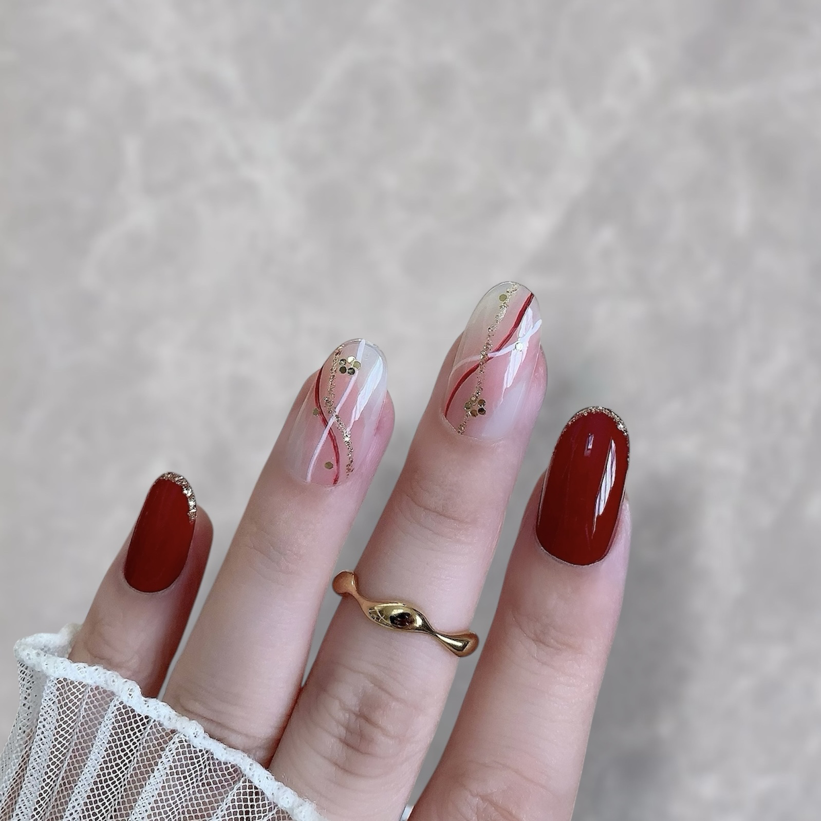 ワンカラーでも指ごとに色を変えるだけでオシャレに見えます💕 画像のようにゴールドラインとストーンを少し足すだけで華やかさがアップ🥰 何度かご紹介したことのあるスポンジで作るグラデーションです✨ スポンジを使うことで境目が綺麗に馴染んでくれます💕 アルミホイルの上でブラウンとトップコートを1:1くらいで混ぜたものを、トップコートのハケに取って3箇所に塗るだけ👌 事前に混ぜたものを塗ることで、爪の上でぼかすより簡単に出来ます💕 ベースカラーが乾く前に点置きしてぼかすことで綺麗にぼかせます✨ スピードが大事なので、使うポリッシュのキャップは全て開けておきましょう😊 天然石のラインはガタガタの方がより天然石っぽく見えるので、ラインを描くのが苦手な方でも大丈夫🙆♀️ 難しそうに見えて、やってみると意外と簡単に出来ます♡