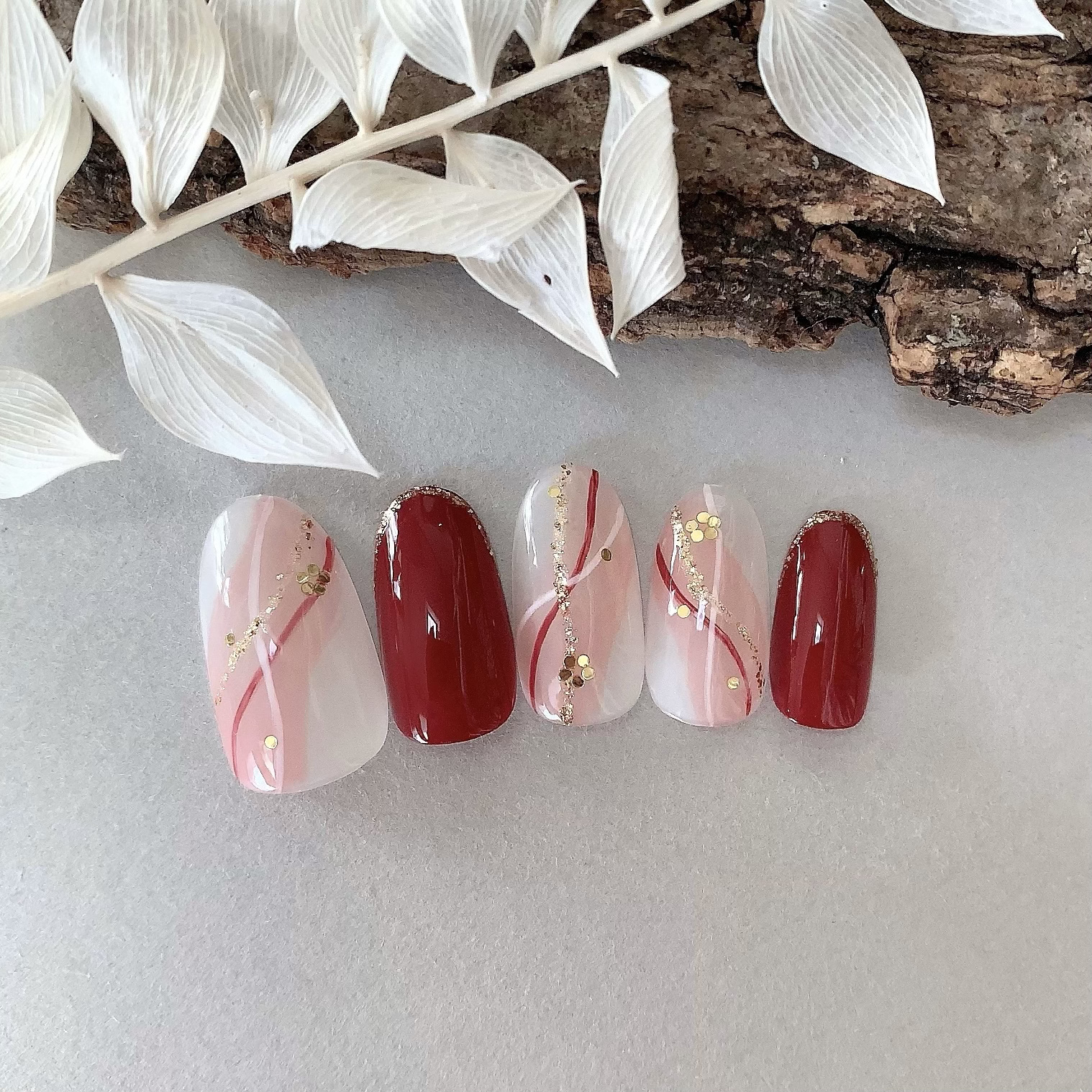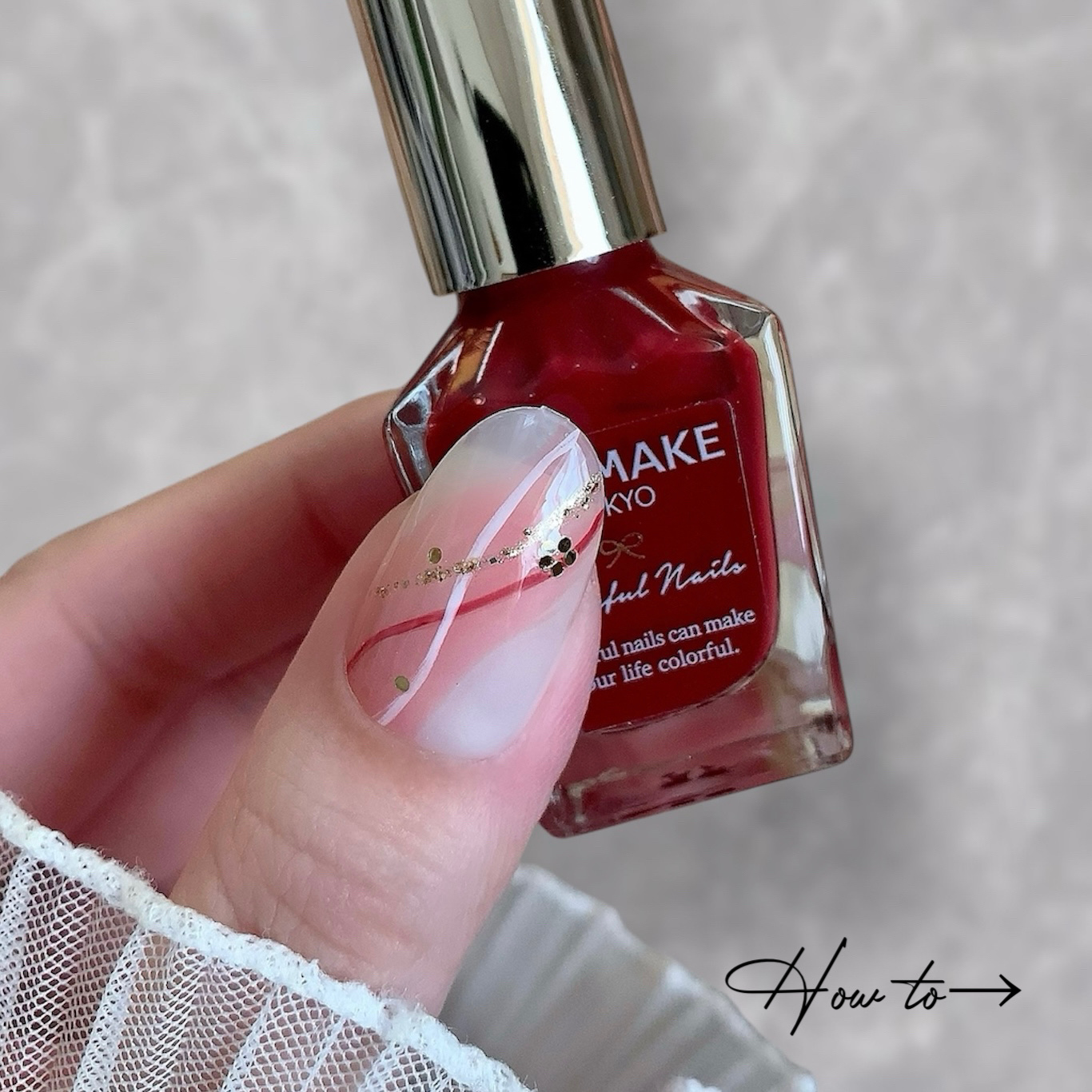 ミルキーな白とハッキリした赤! セリアの和柄ネイルシールで華やかに🌸 ネイルホリックのマットコートはかなりの速乾で、両手を塗ってるうちに乾いて軽く触っても大丈夫になります◎ ネイルホリックのRD410は、ほんの少し暗さを感じる鮮やかな赤。 彩度が高すぎる派手派手な感じではないけど、ハッキリ目立つニュートラルな色。