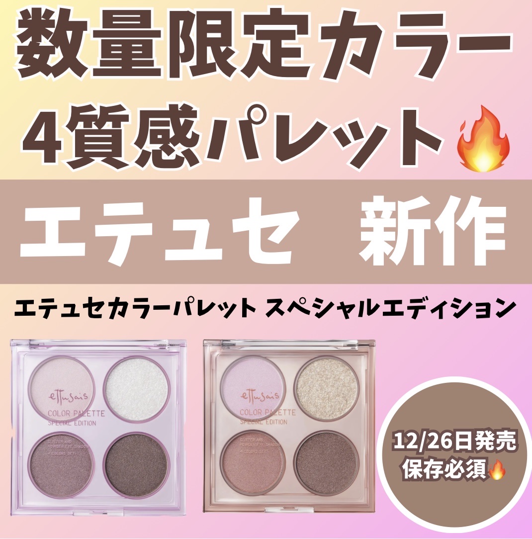 うるきゅる可愛いちゅるんまぶた♡12/26(金)数量限定発売———-♡——————–♡———エテュセカラーパレット スペシャル エディション全2色 各2,130円(税込)———-♡——————–♡———このパレット透明感とうるうる感がすごい!...