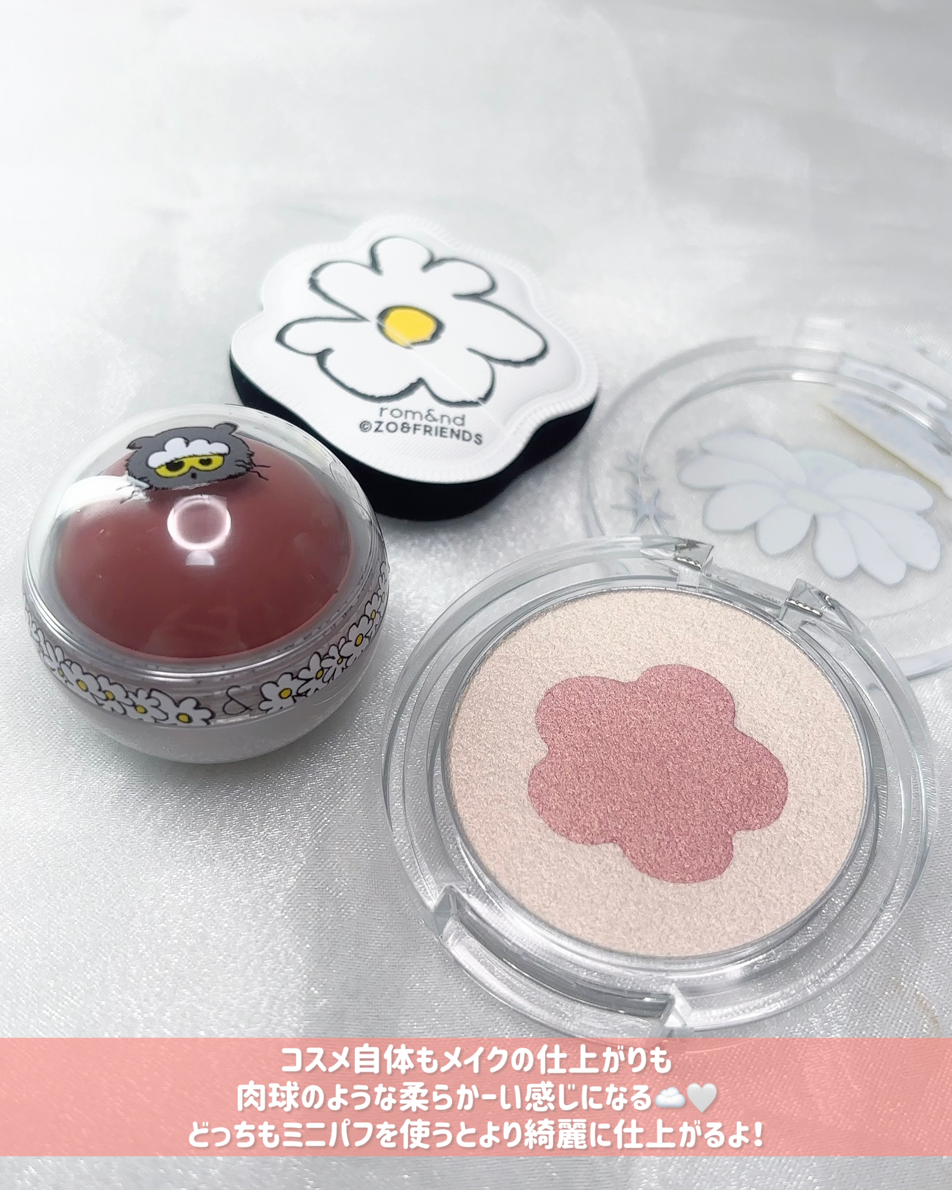 romand✖️Zo&FRIENDS自分で購入した分のジューシーロールチーク&パフセット08キトゥングレープ&09メロウデイジー🐾練りチーク苦手だったんだけど凄く使いやすいの!😳✨指でトントン広げても簡単に濡れたような艶と柔らかい血色◎毛穴が...