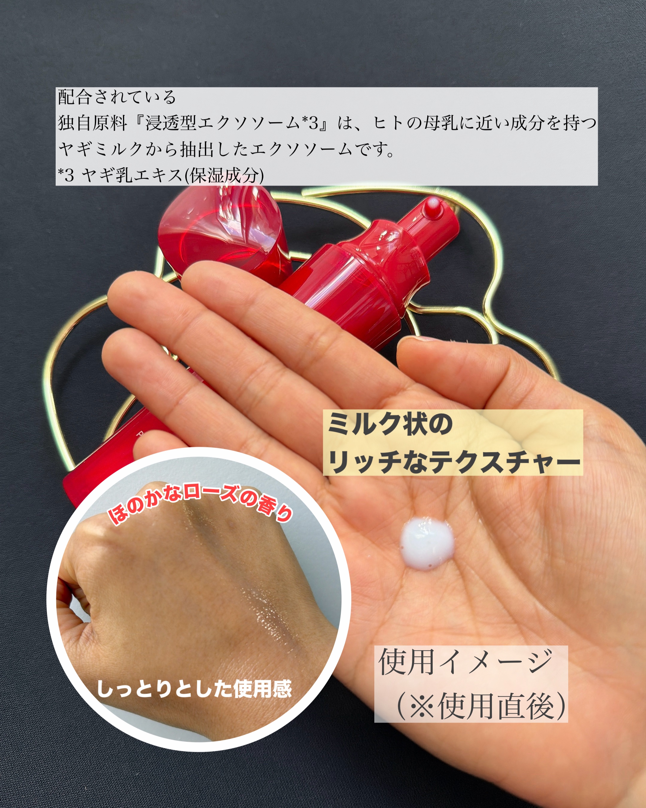 - 洗顔後、スキンケアの最初に使う導入美容液。 みずみずしく清らかなミルクエッセンスが、肌にすばやくなじみ浸透*。 肌のすみずみ*を豊潤なうるおいとハリで満たし、やわらかでイキイキとした肌へ。 ■主な成分 浸透型エクソソーム、サーチュライザーS6(肌にハリと弾力を与える保湿成分) アクアスタックコンプレックス(肌にうるおいとツヤを与える保湿成分) プルーン分解物、アミノセラミド(角質柔軟・浸透*補助成分) 水密ブースト処方(美容保湿成分を肌に届ける処方) 弱酸性、無着色、無鉱物油、パラベンフリー、アルコールフリー アレルギーテスト済み(すべての方にアレルギーが起きないわけではありません) 肌にうるおいを与えて乾燥による小ジワを目立たなくし※、ハリ・弾力に満ちた肌を保ちます。 ※効能評価試験済み *角層まで ダマスクローズを基調としたエレガントで深みのある香り 2025年10月1日(水)から@cosme TOKYO、@cosme NAGOYA、@cosme OSAKAで先行販売