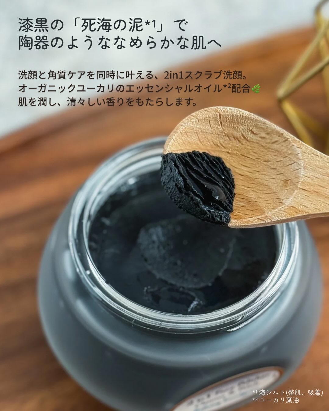 - 洗顔と角質ケアを同時に叶える、泡立て不要の2in1スクラブ洗顔。 汚れや古い角質を一掃し、透明感*2 のある、毛穴レス*3 のつや肌に磨き上げます。 死海の泥*4 配合で、過剰な皮脂のほか、肌表面や毛穴に堆積した汚染物質*5 を吸着し、くすみ*6 のない肌に導きます。 ミネラル豊富な死海の塩*7 配合で肌をすこやかに整え、ジェリコローズ*8 、ドナリエラ*9 配合で肌に潤いを与えます。 なめらかなクリームに浮かぶのは、植物由来のホホバエステル*10 とセルロース*11 によるスクラブ。丸く加工されていることで肌あたりがやさしく、肌の上をすべるようにして古い角質や毛穴の汚れをやさしく取り除きます。 オーガニックユーカリのエッセンシャルオイル*12 が、デトックスされるような清々しい香りをもたらします。 なめらかなテクスチャーで肌を包み込むように密着し、潤いを与えて肌荒れを防ぎます。 洗いあがりの肌は、洗顔後とは思えないほどしっとりとしたもちもちの感触に。 きめが整い、メイクのりのよいなめらかな肌を体感できます。 マイルドな使用感で、洗顔料として毎日(1日1回まで)使用できます。 泡立て不要で手軽に使用でき、毎日の時短ケアにおすすめです。 フロスト加工を施したラグジュアリーなガラスジャー、または持ち運びに便利なチューブの2種。 自然由来成分94%*13 。ヴィーガン処方*14 。 *1 ユーカリ葉油 *2 古い角質や肌の汚れを落とすことによる *3 毛穴汚れを落とすことによる *4 海シルト(整肌、吸着) *5 汚れ、ほこり、花粉など *6 古い角質や汚れのこと *7 海塩(整肌) *8 アンザンジュエキス(保湿) *9 デュナリエラサリナエキス(保湿) *10 ホホバエステル(洗浄補助) *11 セルロース(洗浄補助) *12 ユーカリ葉油 *13 自然由来指数94%(水を含む)ISO16128に基づく *14 動物性原料を含まない 発売日 2025年9月25日(木) ※9月18日(木)よりルミネ各店にて先行発売、SABON公式オンラインストアにて予約受付開始
