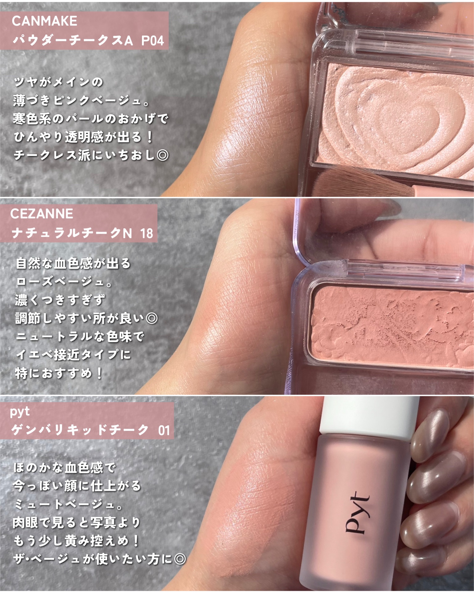 粉質がすごく良くなって、しっとり感とツヤ感が強くなりました! 04が個人的大ヒットで🥹💯 他のチークと混ぜて使うと、ツヤっぽくほわーっとした色付きになって最高! チーク要らない派の方に是非試してみて欲しいカラーです🫶🏻
