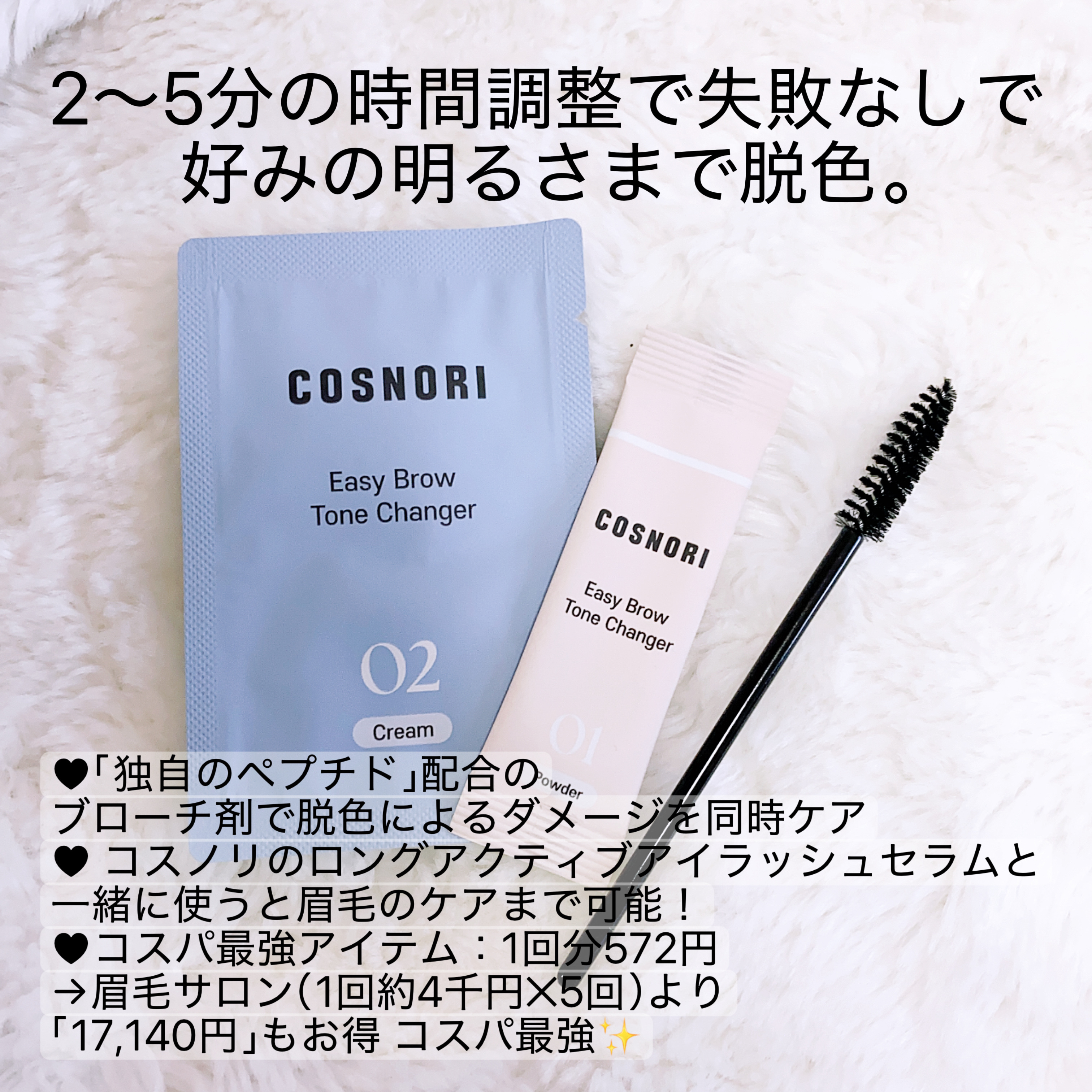 ♚COSNORIイージーブロウトーンチェンジャー♚めちゃくちゃ簡単に垢抜け‼️3〜5分の放置で自然な明るさから金髪まで調整でき、太く濃い眉毛でもしっかり脱色してくれる✨︎︎︎︎︎︎︎☑︎︎軽量なし垂れる心配なし︎︎︎︎︎︎︎☑︎︎「独自のペプ...