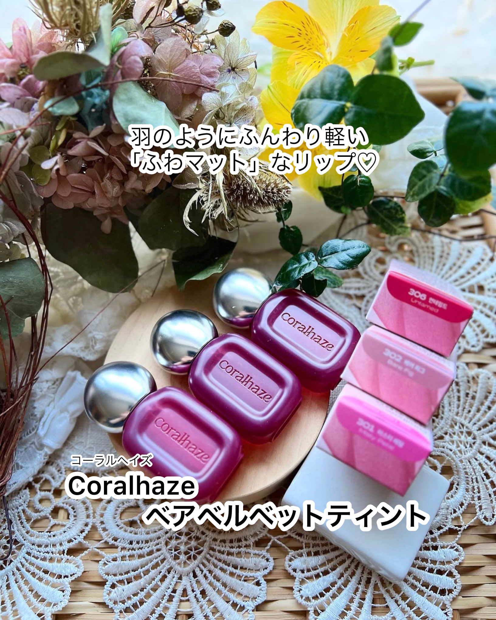 Coralhazeベアベルベットティント@coralhaze_jpマットリップの印象をやさしく更新する「コーラルヘイズ」の新作!大人っぽい可愛さのあるパッケージ、全6色の中から、💋301ミスティペタル💋302ベアフィグ💋306アンテイムドの3...