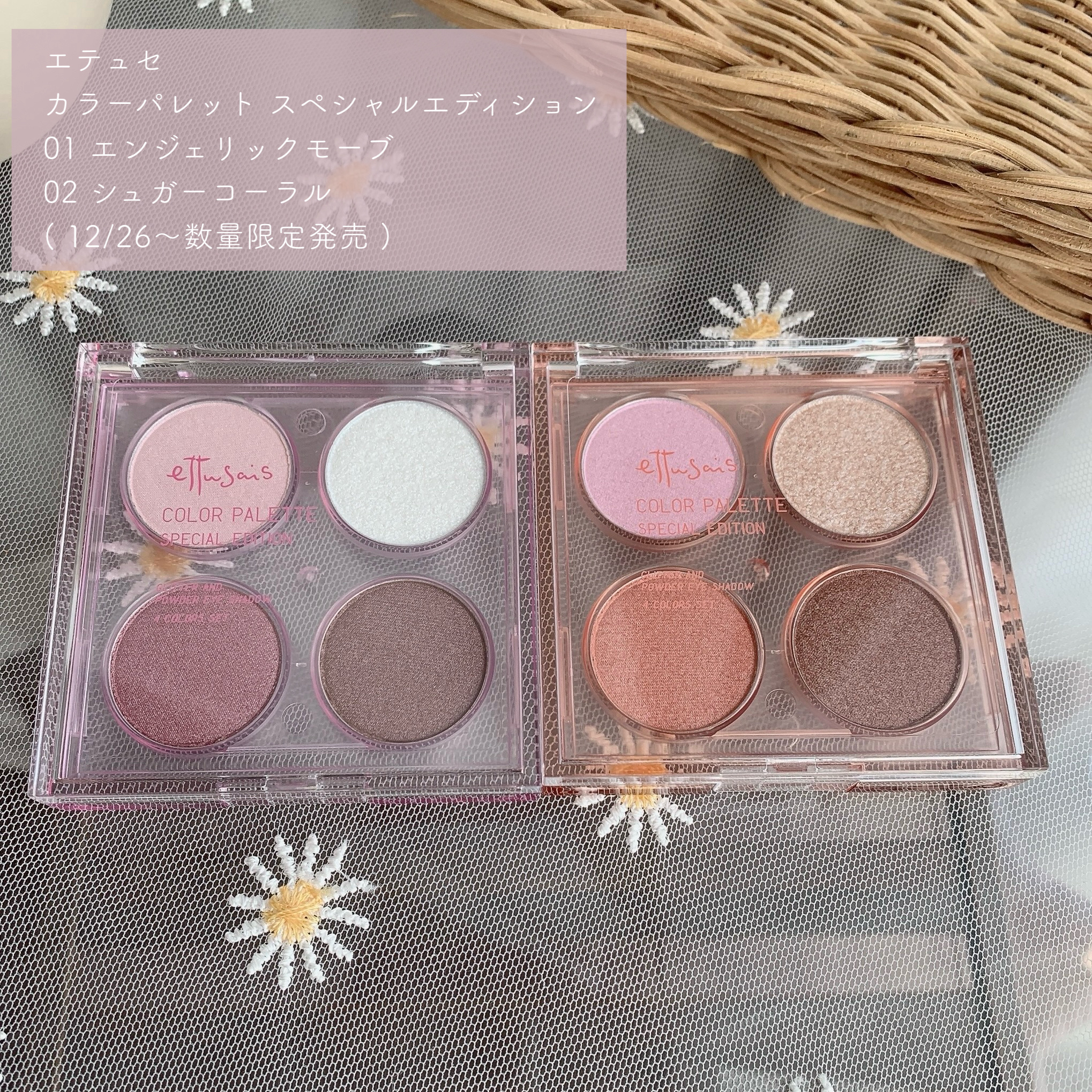 エテュセカラーパレットスペシャルエディション01エンジェリックモーブ02シュガーコーラル各 2310円12月26日 数量限定発売エテュセ様から素敵なアイパレット2色お試しさせていただきました!もう、キラキラ艶やかな目元になれちゃカラーパレット...