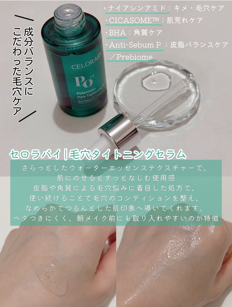 セロラバイ毛穴タイトニングセラム最近の毛穴ケアはこれ🤍さらっとしたウォーターエッセンスで、頬にのせるとスッと吸い込まれる感じが心地いい。ベタつかないのに、肌表面はなめらか。使い続けていると黒ずみが目立ちにくくなった気が😌💭シカ×ナイアシンアミ...