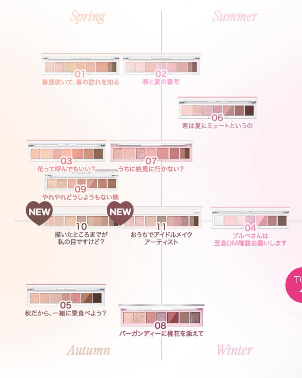🌸periperaAllTakeMoodPallete07うちに桃見に行かない?まず、名前が本当にかわいくてキュンとしちゃいました…!!春らしいピンク〜コーラル系のカラーがぎゅっと詰まっていて、ラメもマットも全部使いやすそうな色ばかりです♡特...