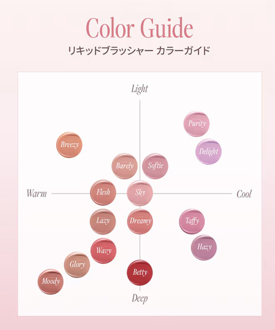 - ・花びらのような血色感をもたらすウォーターリキッドブラッシャー ・ウォータリーテクスチャーでツヤ感を出しながらナチュラルにレイヤリングが可能 ・持ち運びが便利でいつでも血色感をプラスできる ・チーク初心者でもナチュラルに発色するので安心! ・ダリア花抽出エキスのスキンコンディショニング作用によってお肌をケアしながらメイク可能。 ブルベオススメカラー/BARELY×TAFFY イエベオススメカラー/BARELY×DREAMY
