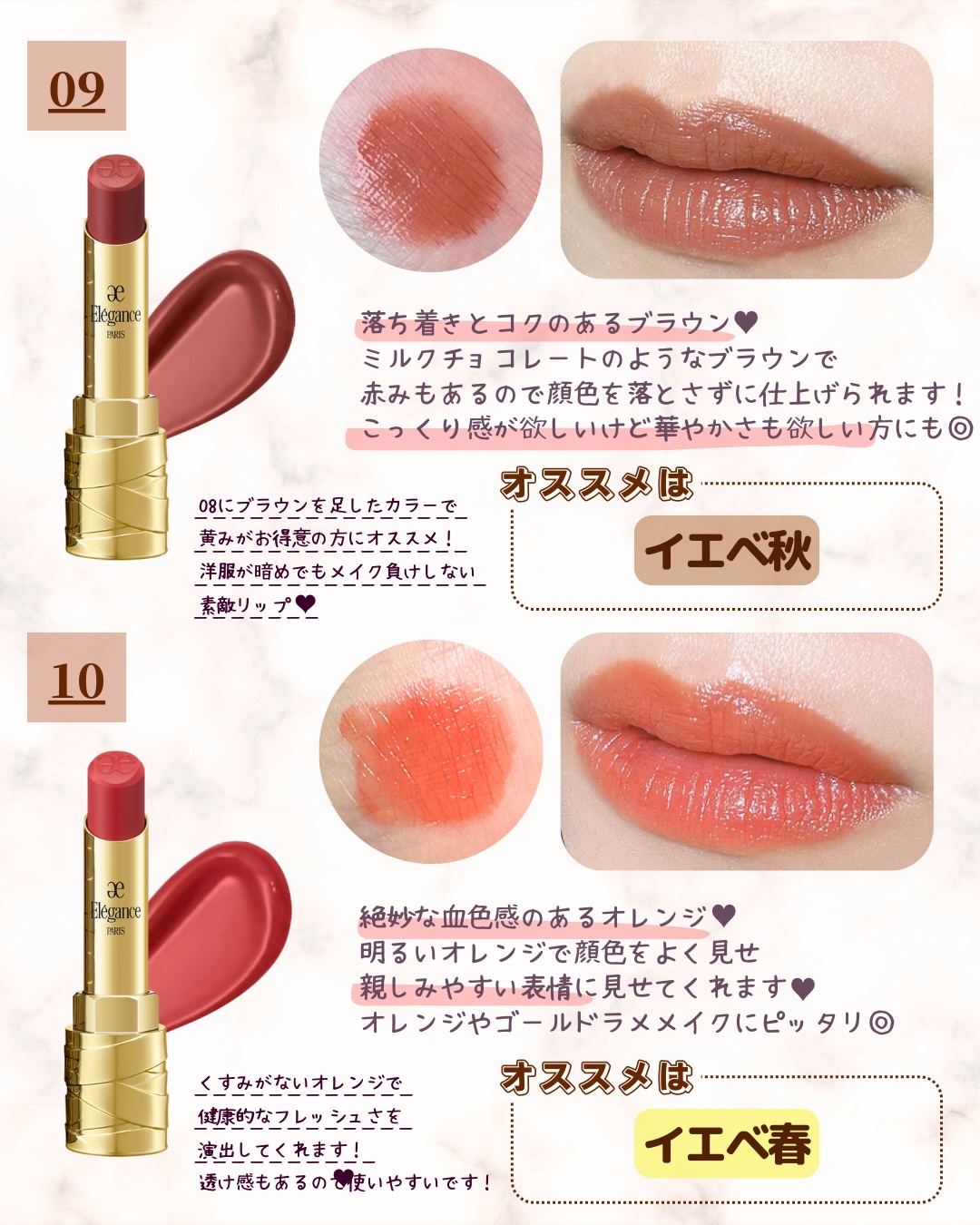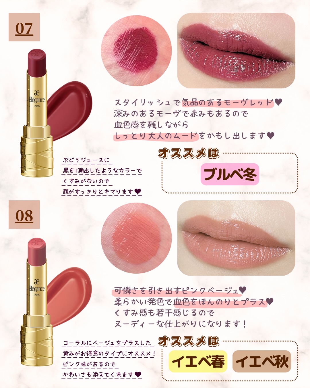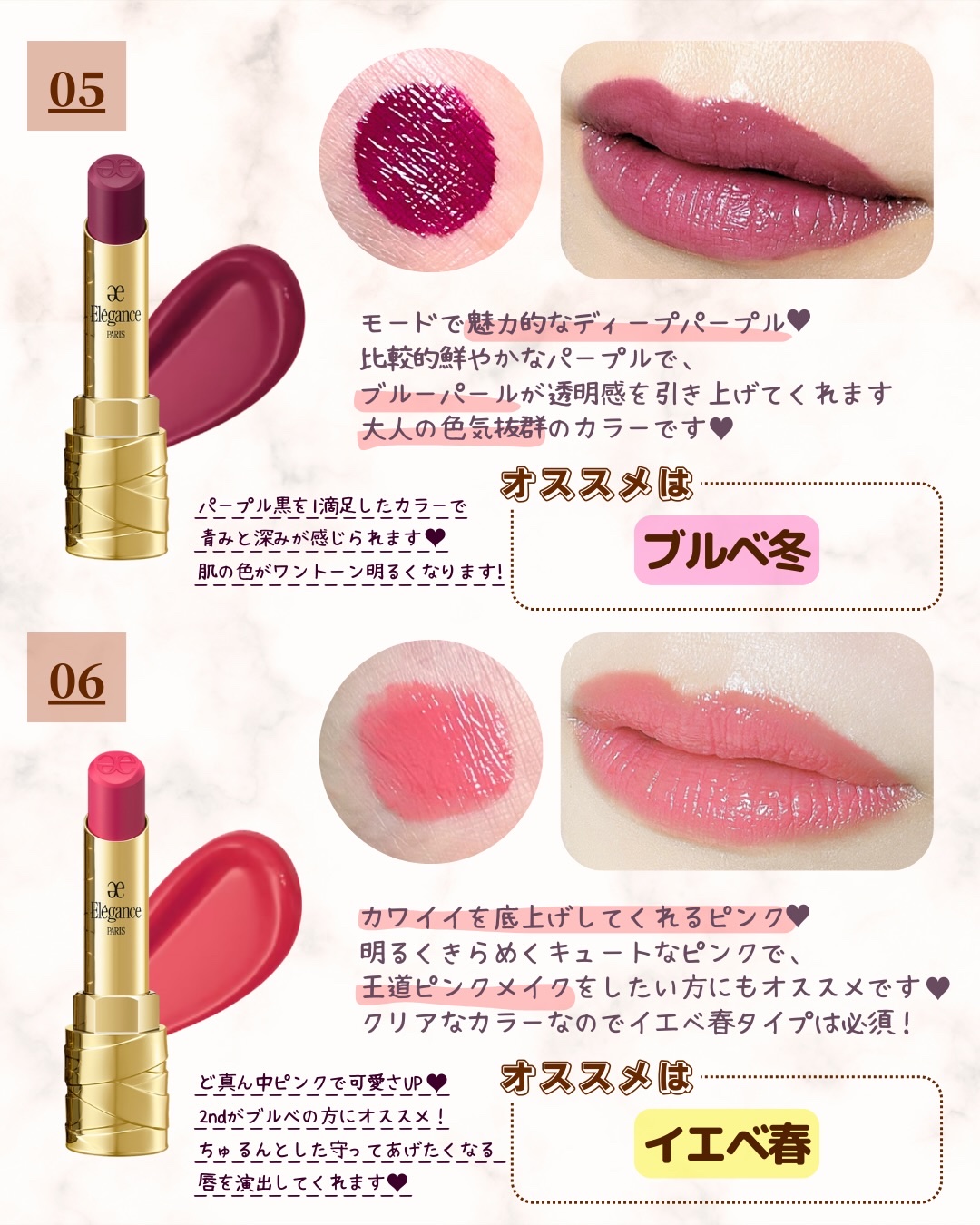 エレガンスルージュクラジュール05エレガンスっていつもどのパーソナルカラーの方でも似合うカラー展開がされてますよね。わたしはブルベ冬なので「ここのブランド憧れるけど、色展開がイエベ寄りだなぁ」みたいなことよく感じます。エレガンスはパッと見ただ...