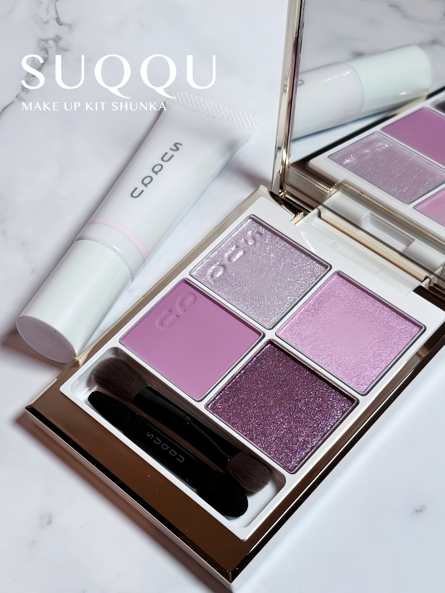 SUQQUメイクアップキットシグニチャーカラーアイズ149舜華-SHUNKA ライラックシルク×ソフトマロウデューイーリクイドブラッシュ103鈴音-SUZUNESUQQU2025ホリデーコレクション左上:シルバーにピンクやブルーの多色ラメ右上...