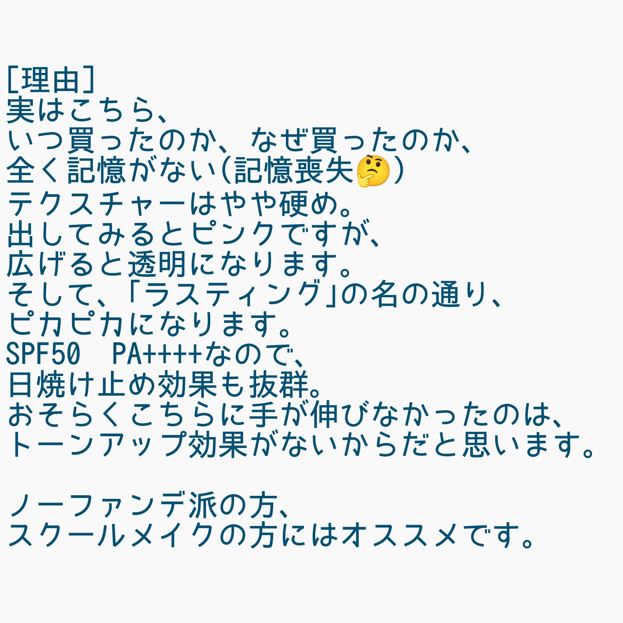 | 日焼け止め・UVケアランキング第8位 | これ1本で日焼け止め・化粧下地の効果があります!伸びも良くて肌なじみがいいです | 詳細を見る | |