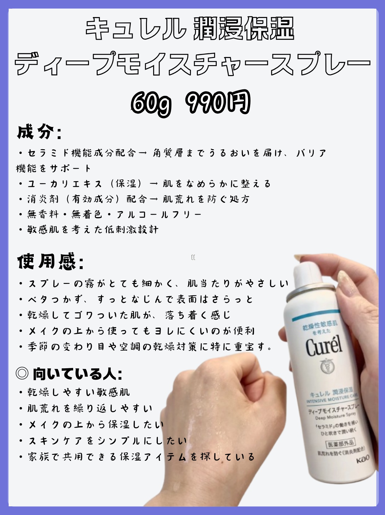 🩵365日、肌に“優しさ”を。 \Curelディープモイスチャースプレー&潤浸保湿乳液レビュー/..肌が敏感になりやすい私の、最近の#信頼保湿コンビ✨ キュレルのディープモイスチャースプレーと潤浸保湿乳液は、季節問わず手放せないスキンケアの定...