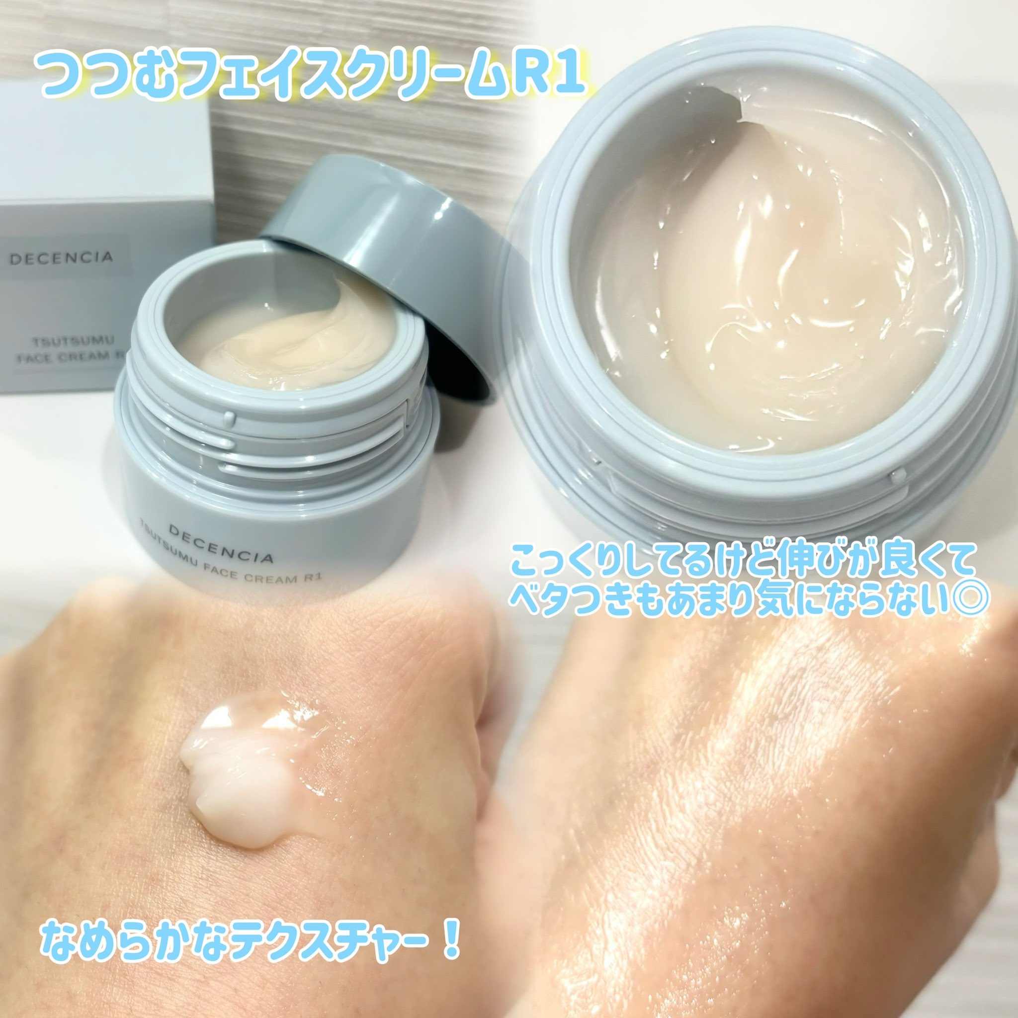 バリア膜が乾燥などから肌を守る🫧 DECENCIA つつむ フェイスクリーム R1 硬めかつしっとりとした質感のクリーム! 濃厚だけどベタつきはなく、肌に1枚の膜を作る感じです🪞 ディセンシアはポーラ・オルビスグループの長年の敏感肌研究が凝縮したスキンケアブランド! ポーラ・オルビスと聞いて期待しかない!