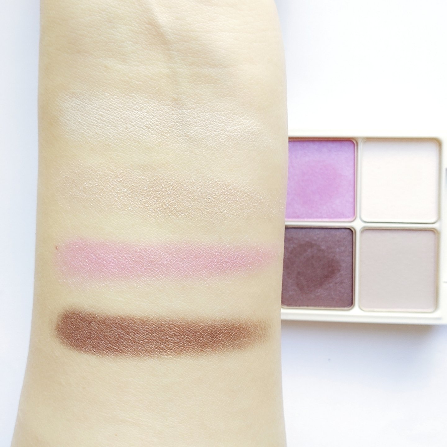 プチプラのクオリティじゃないっ!! 発売前からチェックしていたけれど、ここまで可愛いとは…😆 絶妙カラーで目もとのくすみを飛ばして*明るい印象に🩷 横割りグラデーションでメイクし、立体感をより出したかったので最後に1番左のカラーを上まぶたの真ん中と涙袋にのせています🙆 肌馴染みも良くて粉飛びも感じにくかったです💕 ブラウンの方も店頭に出てたら買おうかな💓