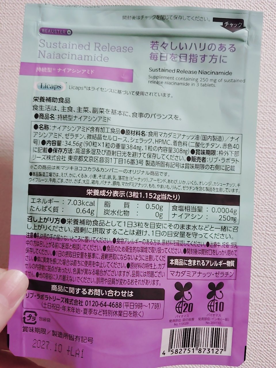 - ãã¿ãã³B 矀ã®ïŒçš®ã§ãããæ°Žæº¶æ§ã®ãã€ã¢ã·ã³ã¢ããã250mgé åã ãªã€ã«in ããŒãºã«ãã»ã«ã«ããæç¶æ§ãç¹é·ã§ãã