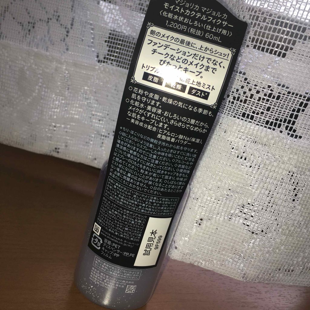 MAJOLICAMAJORCAモイストカクテルフィクサーEX【使った商品】モイストカクテルフィクサーEX【商品の特徴】¥1,320円(税込)60ml化粧水状おしろい(仕上げ用)【使用感】2層式で振るタイプのミストビシャってかかるが割と細かく馴...