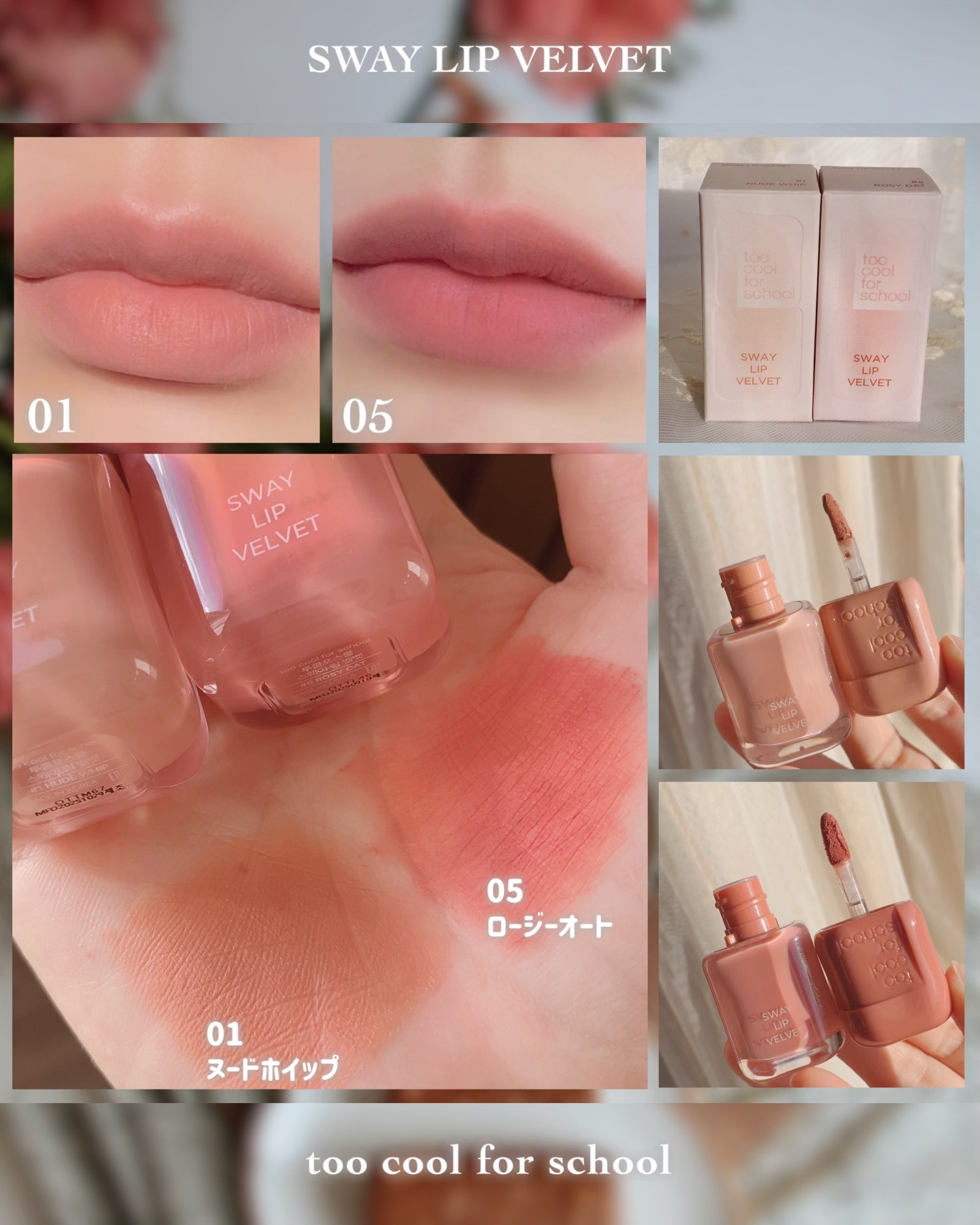 ▼toocoolforschoolスウェイリップベルベット01ヌードホイップ05ロージーオート画像②少量でスルスル伸びる。マット系なのに時間が経っても乾燥せずむしろしっとり。荒れないし色持ちもかなり良い✨ふわっとした仕上がりで、ツヤ感が大事な...