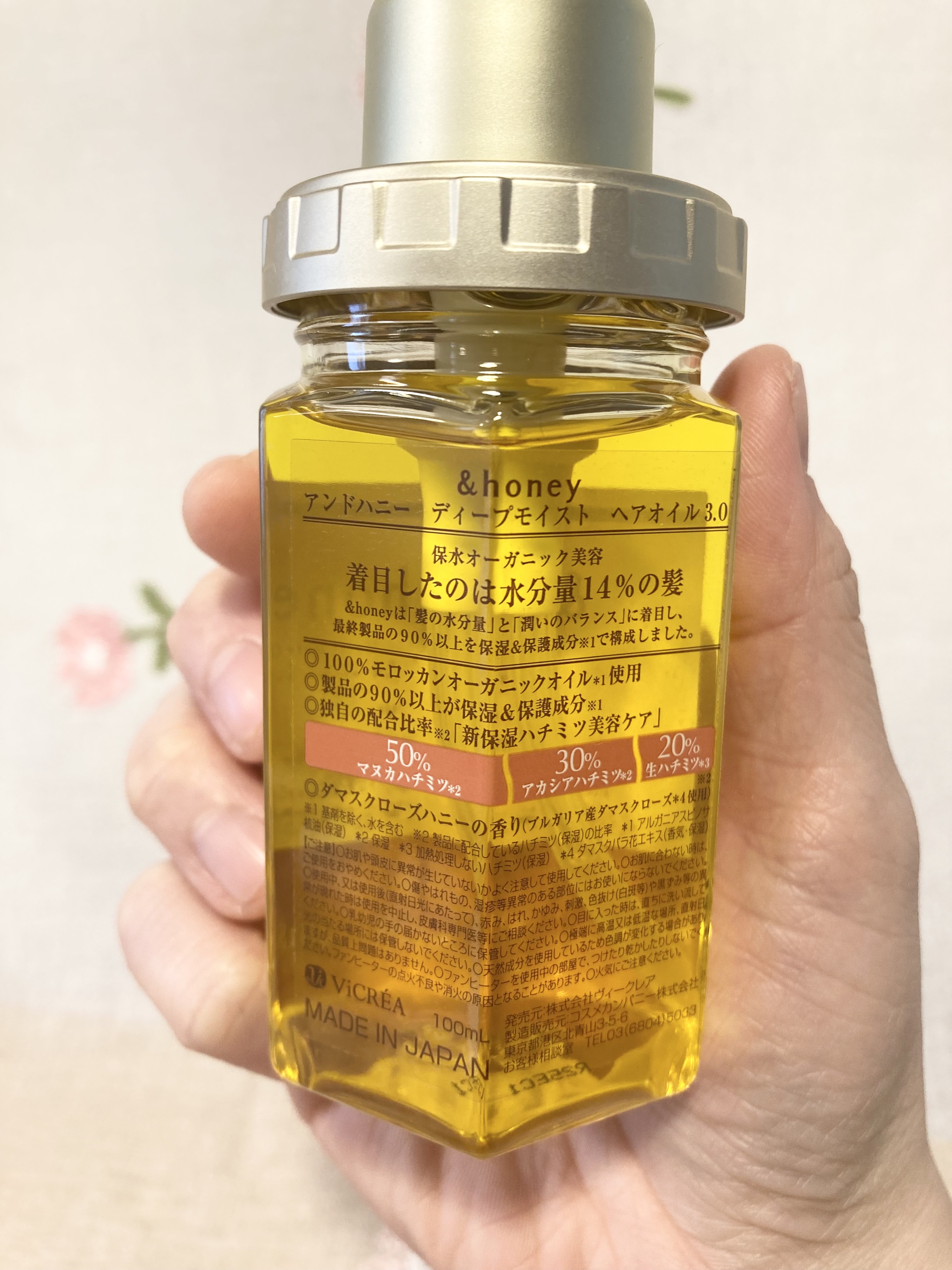 - 水分量14%の髪に着目した、保水オーガニック美容ヘアオイル。 製品の90%以上をハチミツやオーガニックオイル、ローヤルゼリーなどの保湿&保護成分で構成し、髪の芯からみずみずしい潤いを与えます。 100%モロッカンオーガニックオイル使用。無添加&フリー処方。(サルフェート、パラベン、合成着色料、鉱物油、合成酸化防止剤、動物実験フリー)