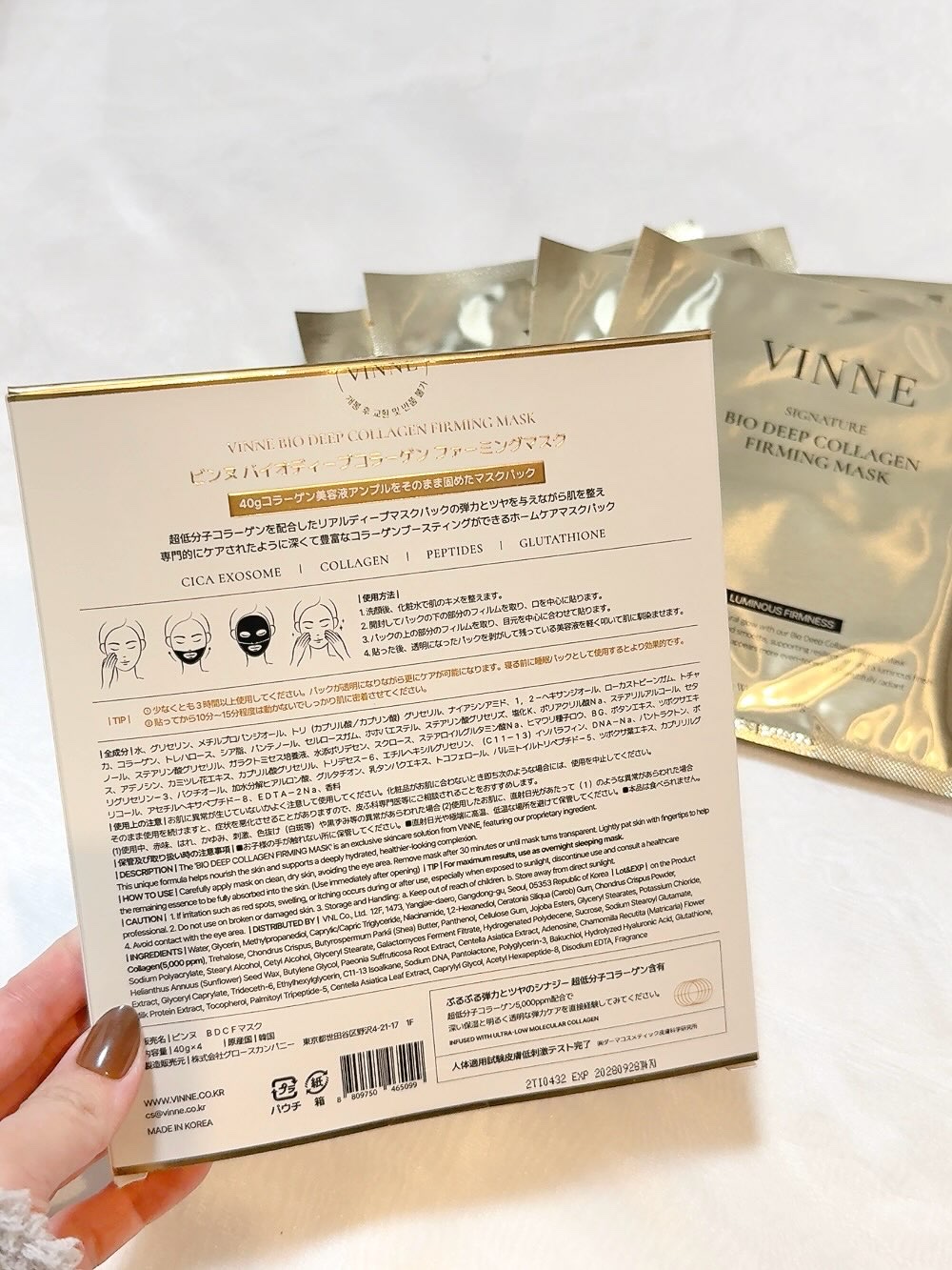 VINNE(ビンヌ)」「シグニチャーバイオディープコラーゲンファーミングマスク」✨40gのアンプルをそのまま固めた新次元マスクパック🩵圧倒的なコラーゲン含有量の高純度コラーゲンマスクです💕ひと箱4枚入りで、黄金色の個包装。ツルツルでプルンプル...