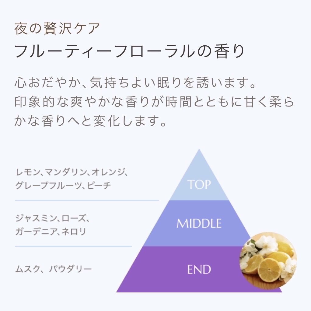 もっちりハリツヤ、翌朝もしっとり。 濃厚さはトップレベルかも。 肌を油膜で覆ってくれる感じなのでしっかり守られている感覚があります。 心おだやかな気持ちよい眠りを誘うフルーティーフローラルの香り。やわらかい香りでキツくない。