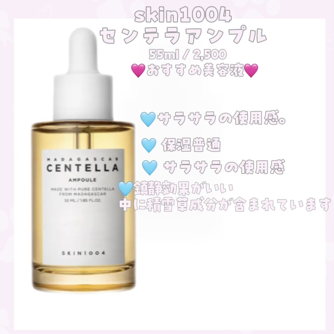 SKIN1004センテラアンプルマダガスカル産ツボクサエキス配合で鎮静効果抜群❗️肌に優しいスキンケアの為に必ず必要とされる成分だけを取り入れた鎮静ライン。感想は、サラッとしたテクスチャーでスっと肌に馴染んでいきますべたつきがないのにしっかり...