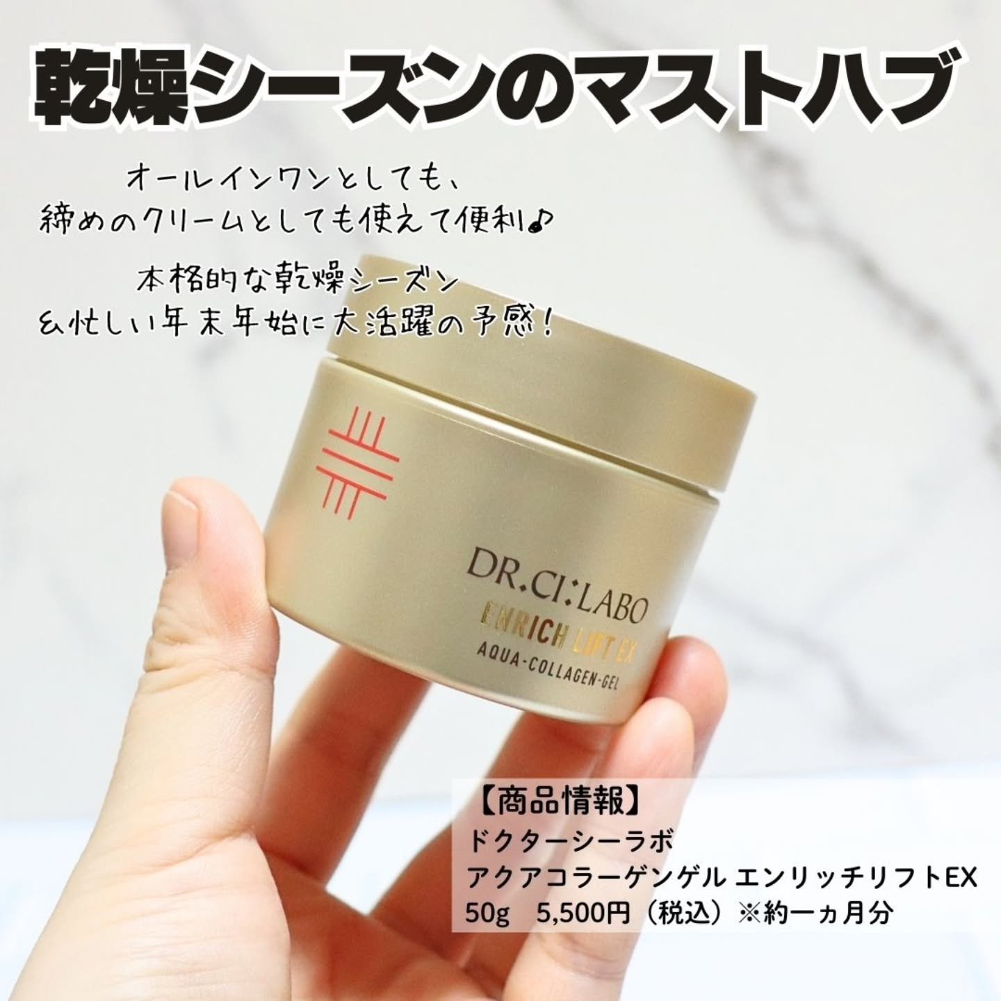 【ドクターシーラボアクアコラーゲンゲルエンリッチリフトEX】冬の乾燥や、乾燥による小ジワ*2にも負けない、うるおうハリ肌へ導いてくれるゲル!オールインワンとしても使えるから、忙しい朝も疲れた夜も心強い!朝はパール2粒、夜はさくらんぼ1粒目安で...