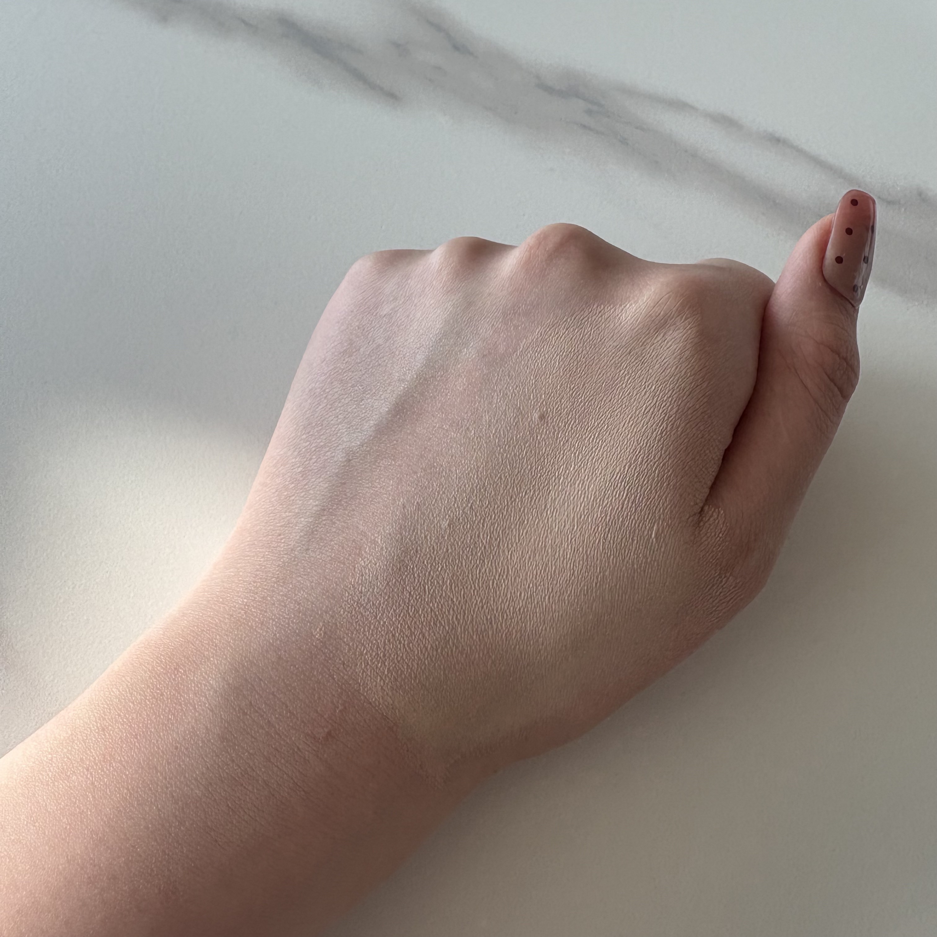 手にとってみた時のテクスチャーは既存のウォータースプラッシュサンクリームと比べると若干重めに感じましたが、肌に馴染ませると変わらず伸びが良いです! まず試しに手に塗ってみた時点で自然なツヤ感とトーンアップ効果に感動✨✨ファンデせずにこれだけでも肌を綺麗に見せてくれます! もちろん顔にも使ってみましたが、セラミド、ペプチド配合で保湿力もアップしたとのことでしたが、朝塗って夜まで乾燥が気になりませんでした! 皮膚科テスト完了、ヴィーガン認証もされているので、敏感肌でも安心して使えます。 そして、既存のタイプに比べてマイルドな香りになった気がします!私は前の香りも好きでしたが、こちらはさらにふんわりとやさしく香ります。