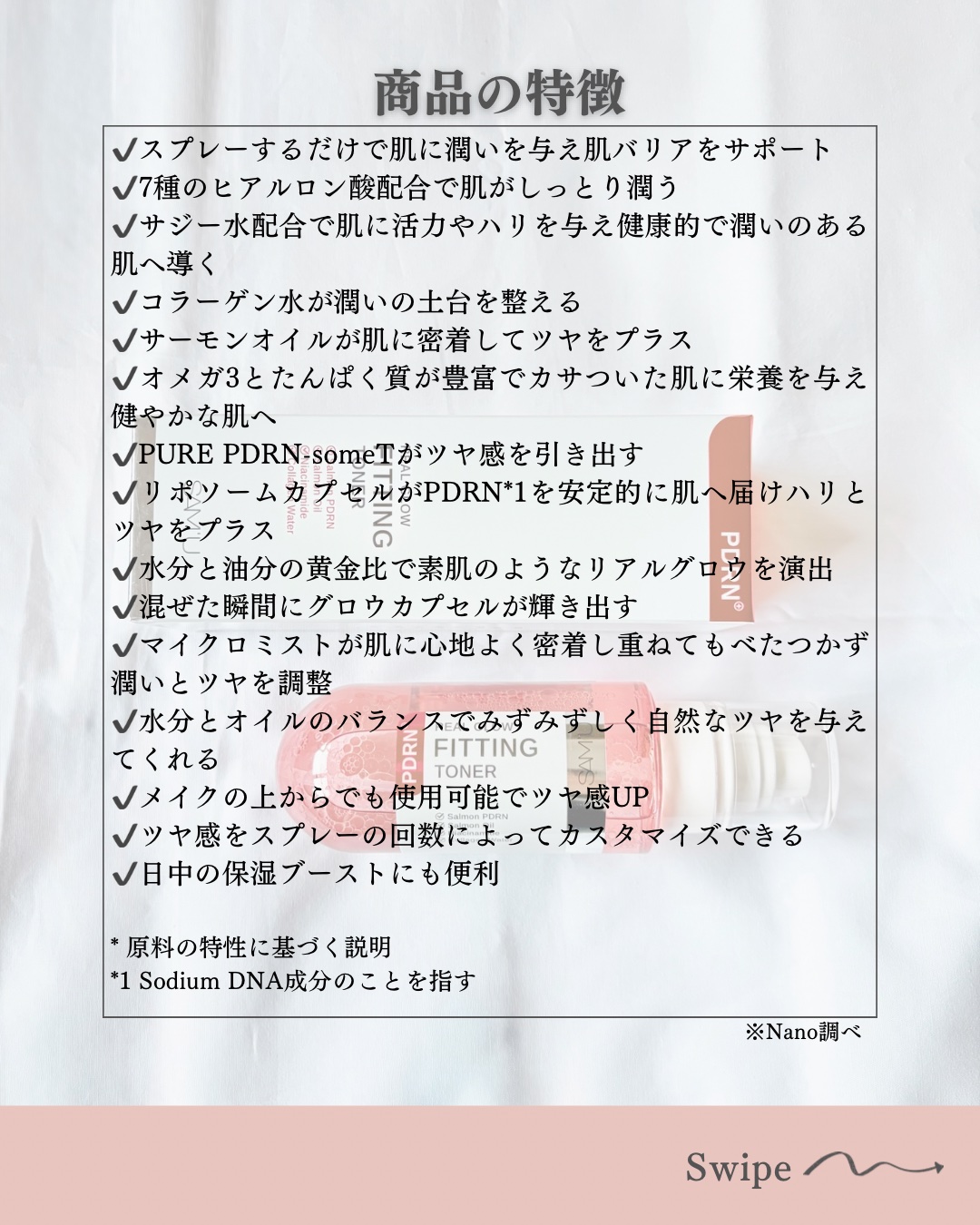 \内側から溢れるようなツヤ肌へ/ ▫️SAM'Uサミュ PDRNリアルグロウフィッティングトナーリポーソーム化したサーモン由来PDRN×サーモンオイルを配合肌本来のツヤを引き出す、ミストタイプの化粧水サジー水・7種のヒアルロ...