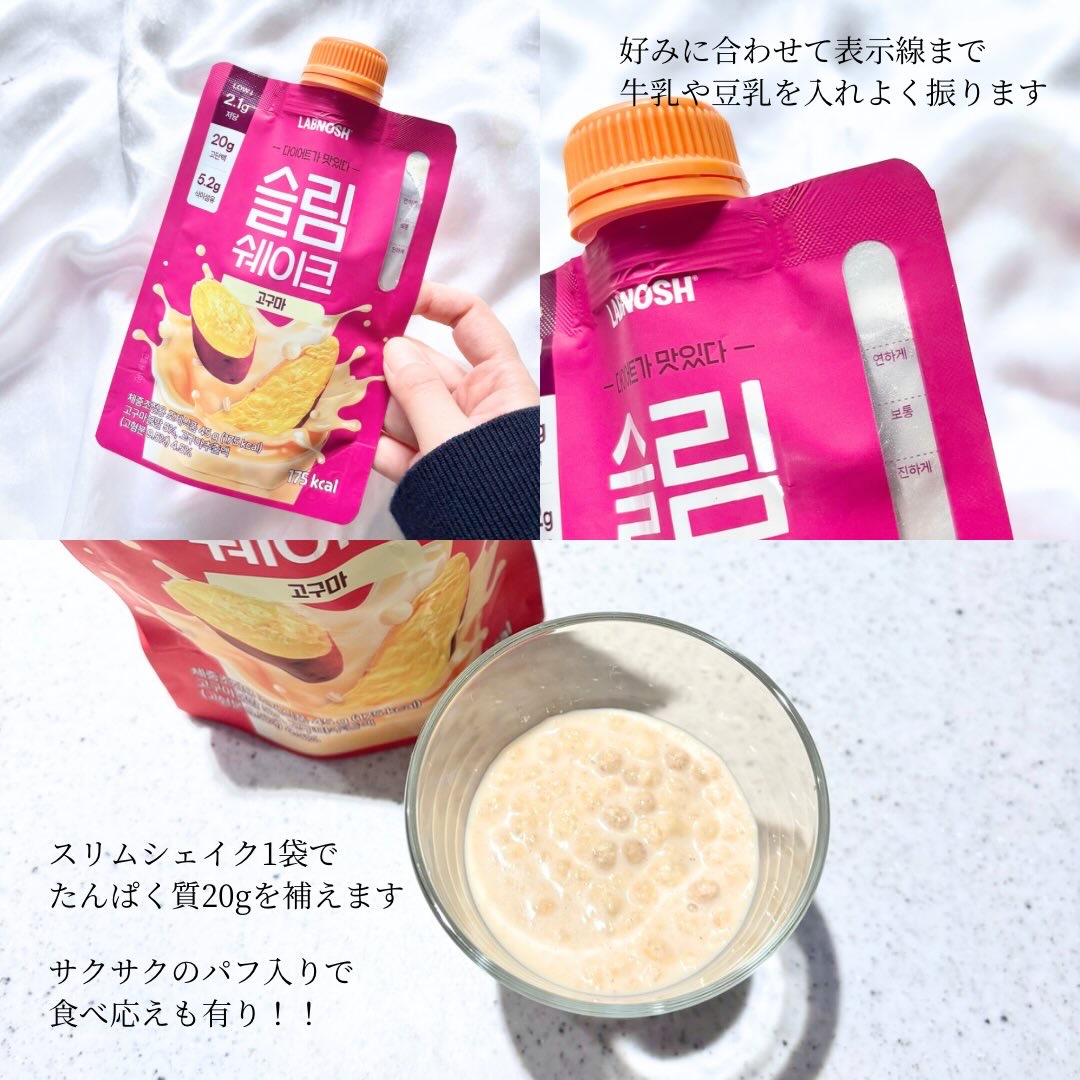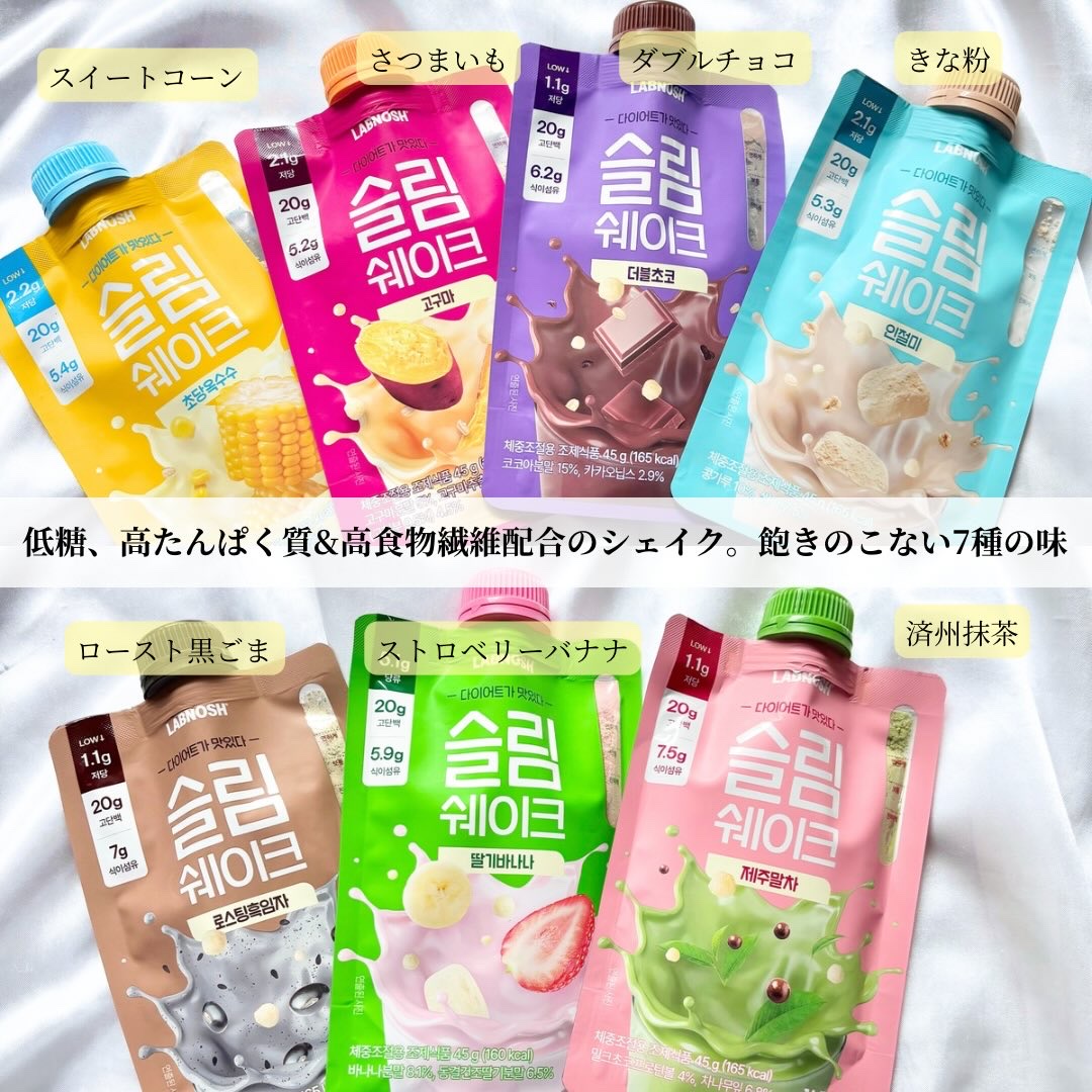 LABNOSHスリムシェイク7種類の味から選べる。・スイートコーン・さつまいも・ダブルチョコ・きなこ・ロースト黒ごま・済州抹茶・ストロベリーバナナ高蛋白質、食物繊維とビタミンミネラルまで配合のスリムシェイク(一つたんぱく質20G以上摂取可能)...