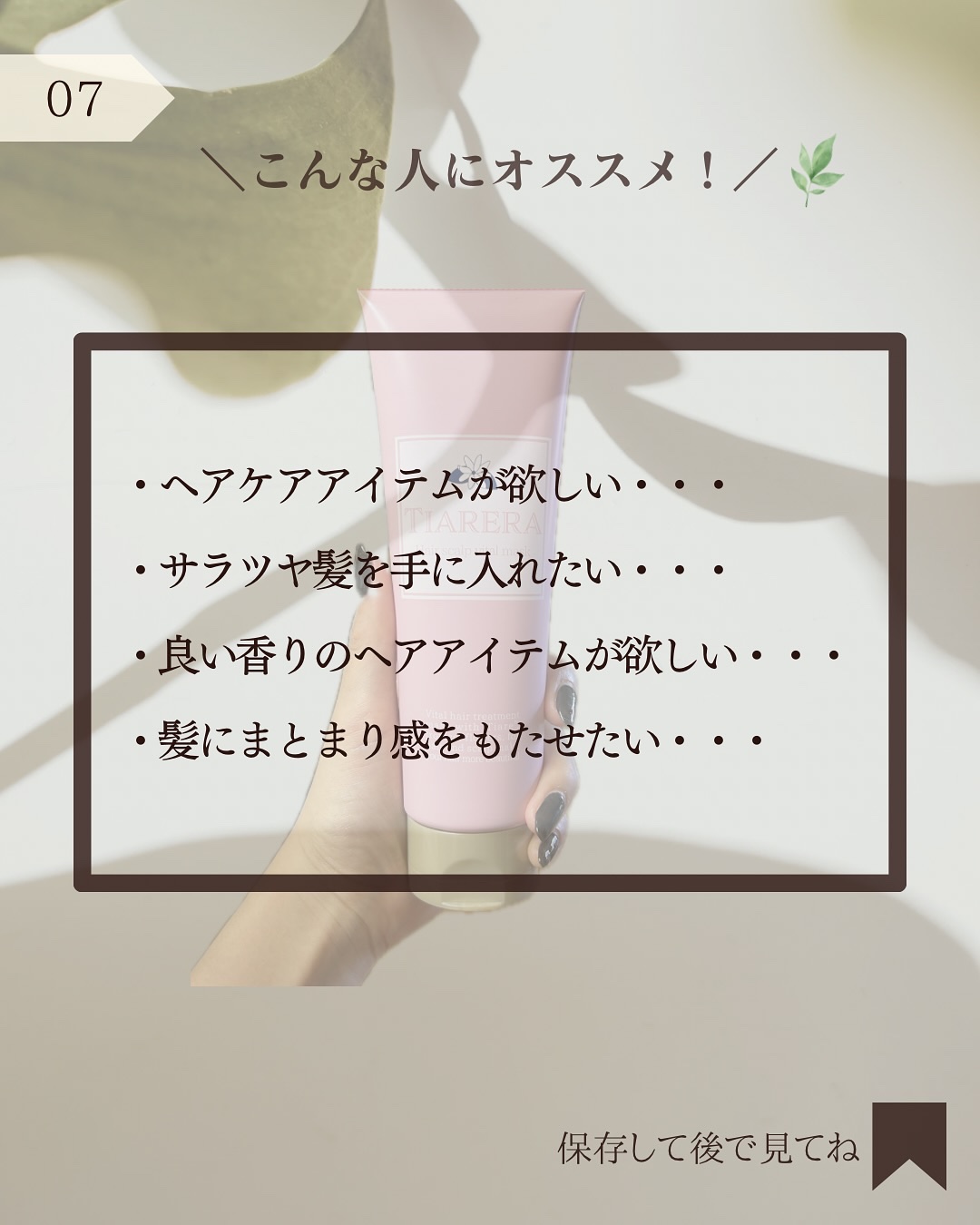 頭皮と髪をWでケアする髪の質感ケアトリートメント。1本で頭皮から髪までうるおい・匂いをケアし、理想のうるつや髪。サロンの「酸熱トリートメント」に着目。 キューティクル補修成分をたっぷり配合しているのでカラーのダメージやごわつきをOFF。TIARERAならではのフルーティティアレの香りが長時間つづく、香るフレグランスヘア。 密着感のある付け心地。南国感のあるフルーティーな華やかないい香りがすごく好き。すすぎ後の髪もとぅるんっとする。