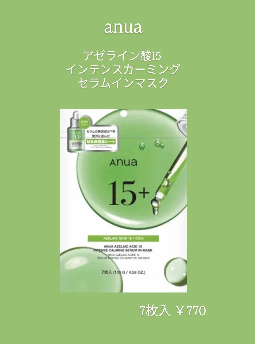 Anuaアゼライン酸15インテンスカーミングセラムインマスク気になっていたAnuaのフェイスマスク😊✨こちらを選んだ理由は、赤みや皮脂が気になるので鎮静を期待して購入してみました💕薄めのシートですが、柔らかく肌あたりが良くてうれしいです🥰液の...
