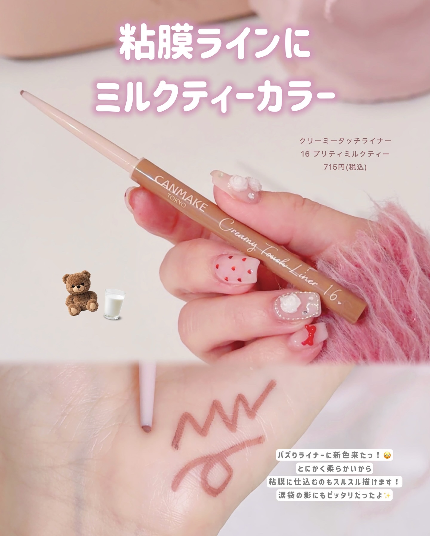 キャンメイク新作📢✨#クリーミータッチライナー16:プリティミルクティー🫖このライナー大好きで何本も持ってるんですが、今回も可愛い新色きた…使いやすい柔らかブラウンありがたい🙏🏻#トゥインクルジュエリープランパーオイル配合だけどベタつかない!...