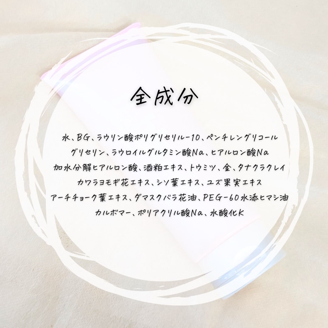 - 水、BG、ラウリン酸ポリグリセリル-10、ペンチレングリコール、グリセリン、ラウロイルグルタミン酸Na、ヒアルロン酸Na、加水分解ヒアルロン酸、グルコシルセラミド、金、タナクラクレイ、カワラヨモギ花エキス、シソ葉エキス、ユズ果実エキス、アーチチョーク葉エキス、ダマスクバラ花油、α-グルカン、PEG-60水添ヒマシ油、カルボマー、ポリアクリル酸Na、水酸化K