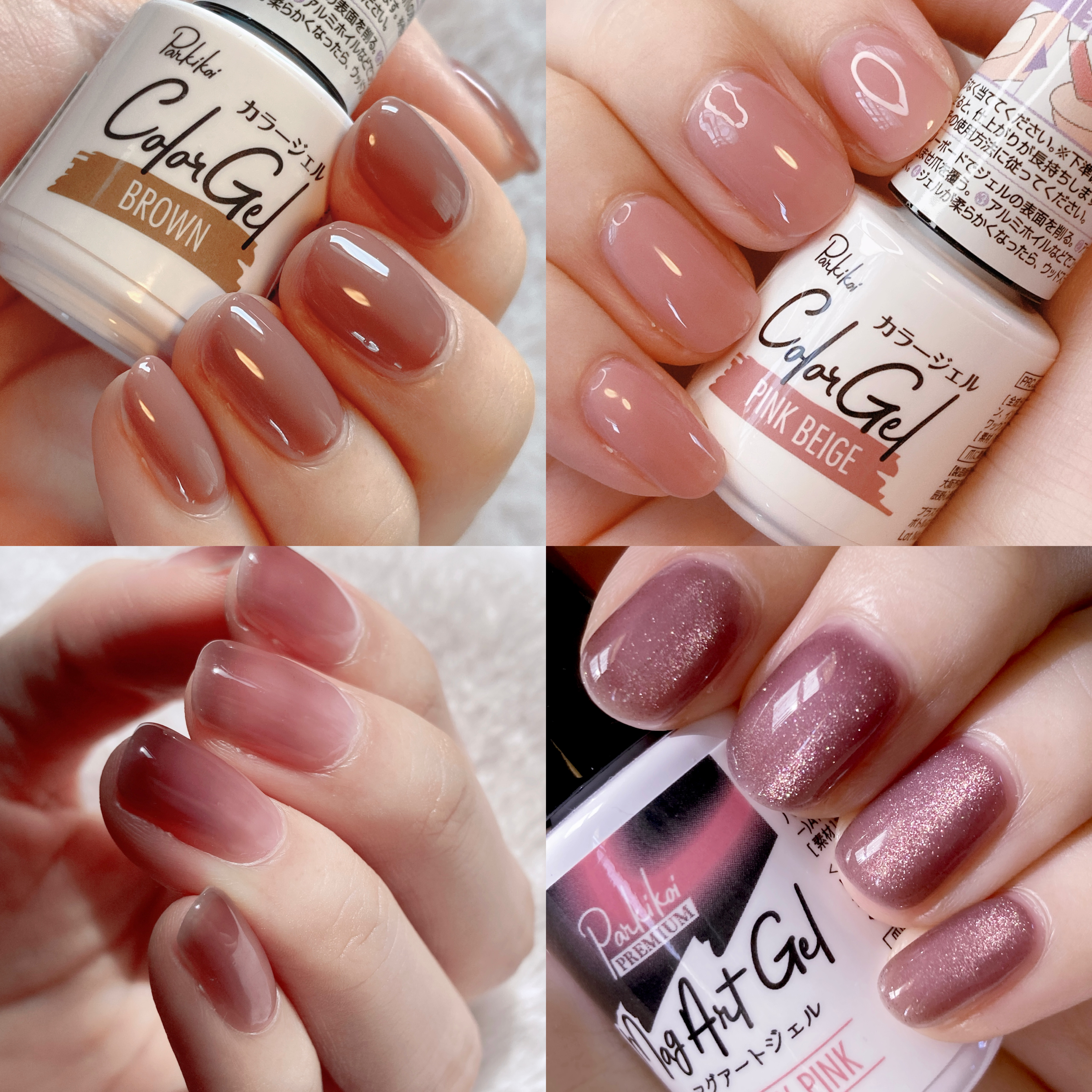 ローズブラウンだけこの中だとすこし透明感が低い色 落ち着いたカラーで使いやすいです 他2つはクリア度が高い色ですベースカラーが透明のままだと 自爪の色が透けてもっとピンクぽさが強く出ます ベース:セリア ピールオフベース トップ:ネイルタウン irogel グロッシートップ (ノンワイプトップ)